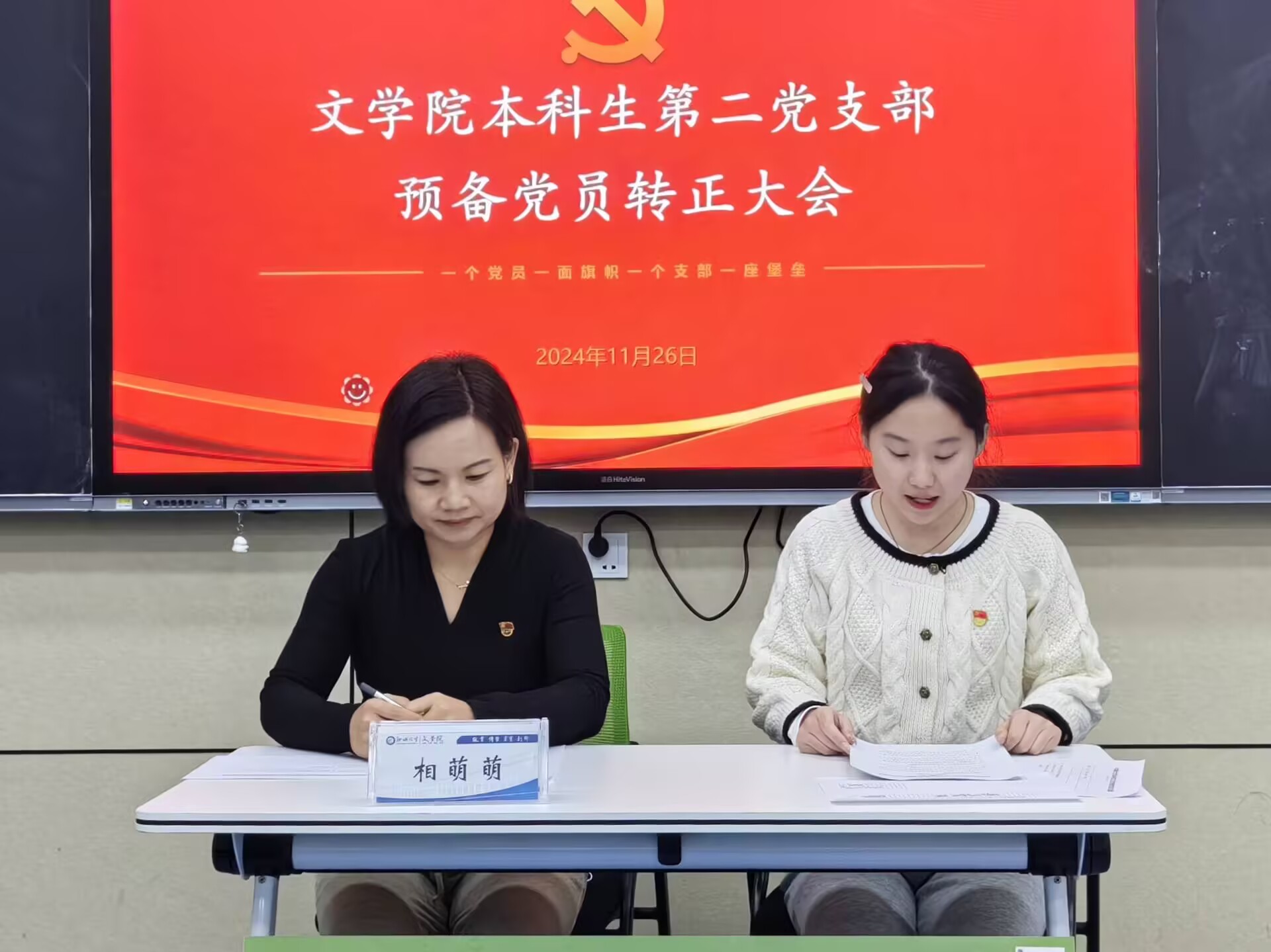 大会在庄严的国歌声中正式拉开帷幕,全体成员起立奏唱国歌。按照预备党员转正程序,赵文倩等5名预备党员分别向党组织汇报自己在预备期间思想、学习、工作等情况和自身存在的不足之处,表达自己加入中国共产党的坚定决心和愿望。入党介绍人及与会人员对赵文倩等5名预备党员在预备期间的积极表现给予肯定,并提出相应意见和建议。大会经过充分讨论和民主评议,采取无记名投票的方式进行表决,一致同意赵文倩等5名预备党员按期转为中共正式党员。随后,相萌萌宣读支部大会决议:赵文倩等5名预备党员在预备期间恪守党员职责,以党员标准严格要求自己,注重理论学习,对待工作认真负责,积极参与社会实践,表现出良好的党性修养和较高的政治素质,在生活中,较好发挥先锋模范作用,已基本具备正式党员的条件,同意接收为中共正式党员。大会决议宣读完毕后,相萌萌首先对新党员表示祝贺,她强调作为一名正式党员要时刻保持头脑清醒,铭记自己肩负的责任和使命,鼓励新党员要继续加强理论学习,不断提高政治素养,严于律己,以实际行动践行党的宗旨,为党的事业贡献自己的力量。会议最后,全体党员起立,在领誓人的带领下,全体党员面向党旗,庄严宣誓。会议在庄重而热烈的气氛中圆满结束。