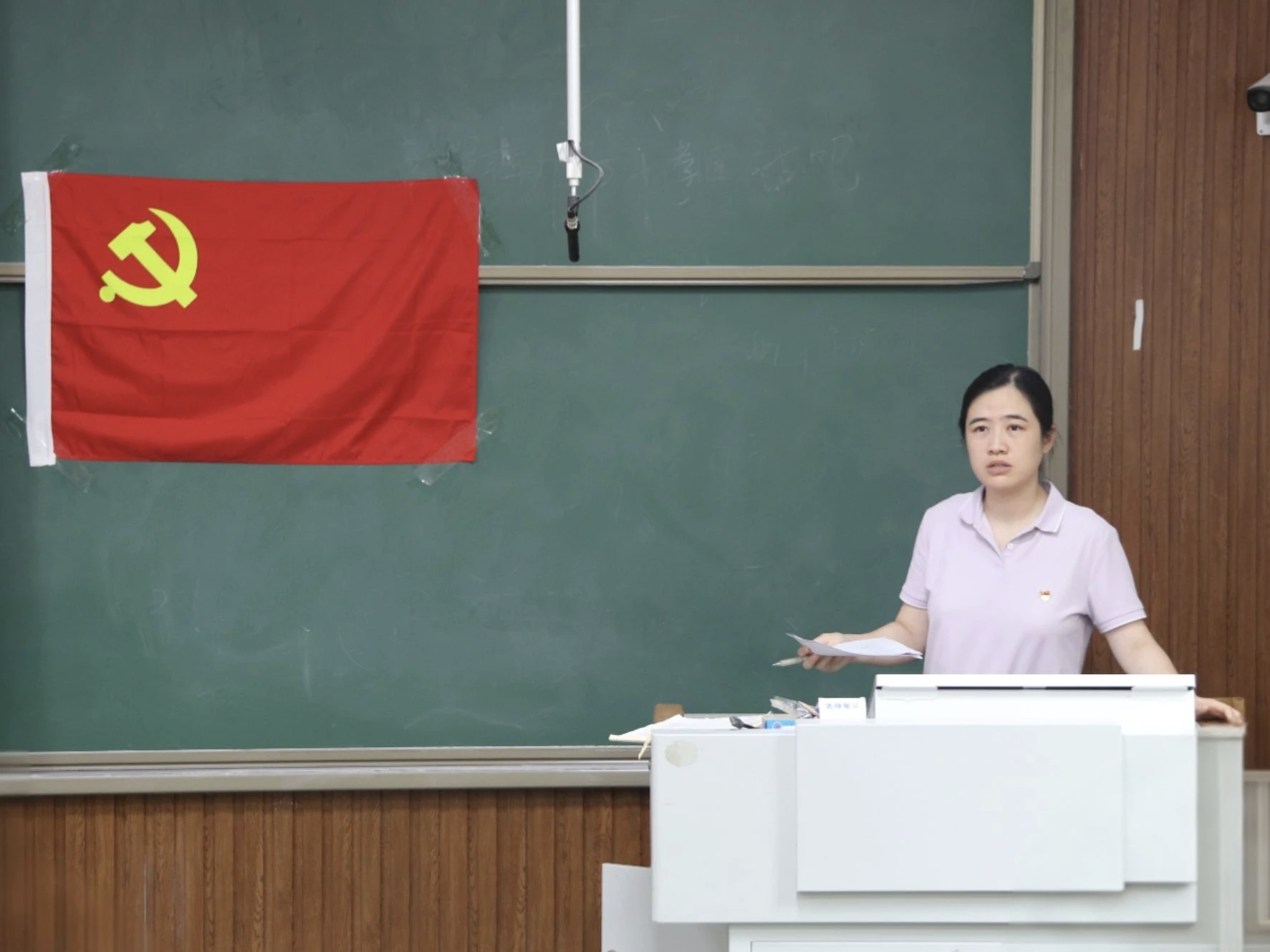 全体人员起立,面向国旗,齐唱国歌。大会正式开始,会议严格依照预备党员转正流程,纪雯慧等17名预备党员依次宣读转正申请,向党组织全面汇报了一年预备期内思想淬炼、学习提升、工作实践等方面的成长历程,深刻剖析自身优缺点,并清晰规划未来努力方向,表达自己加入中国共产党的坚定意志与决心。入党介绍人贾瑞清、徐一凡、梁淑婷、张佳骏分别介绍17位预备党员的综合表现,肯定她们的成绩并提出意见和建议。随后,有表决权的正式党员对纪雯慧等17名预备党员的转正问题进行举手表决,一致同意纪雯慧等17名预备党员按期转为中共正式党员。贾瑞清宣读支部大会决议:纪雯慧等17名预备党员思想进步,严于律己,在预备期内认真学习党的路线、方针、政策,努力提高自身政治素质,已基本具备正式党员的条件,同意按期转为中共正式党员。会议最后,在梁淑婷的领誓下,全体党员起立,面向党旗庄严宣读入党誓词,誓词朗朗,掷地有声,彰显着党员们对党忠诚的坚定信念与为共产主义事业奋斗终身的崇高理想。