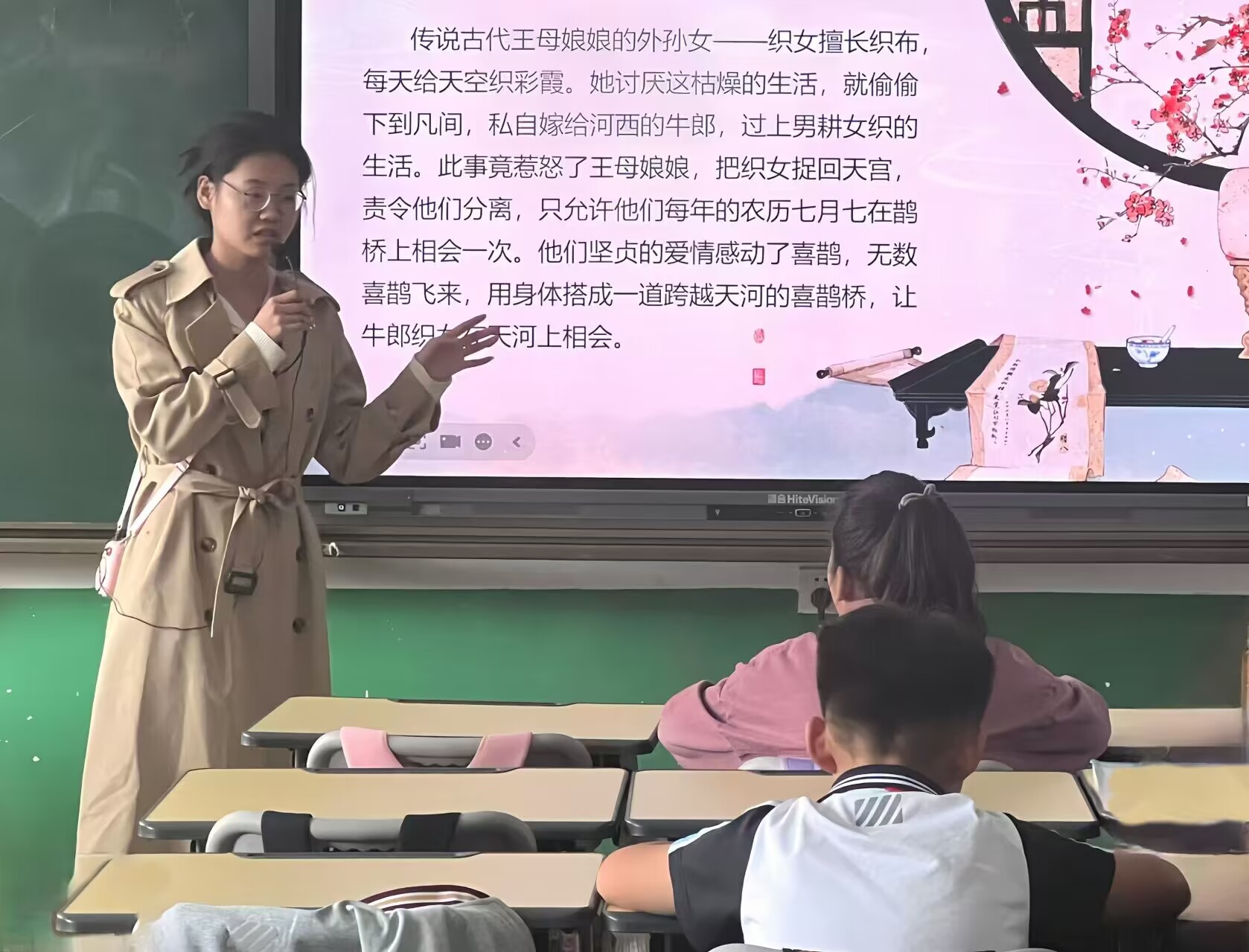 在我给五年级五班上语文课的时候,由于班里一半的学生都去了学校组织另外的磨课活动,留在班里的学生还剩二十几个,大多数是成绩一般的学生,甚至有少许刺头,上课时常打断老师讲话,但我并没有因此责备他们,因为他们都很积极地回答我的每一个问题。起初,同学们看到我是新来的老师,或许是因为他们对我有些许新鲜感,课堂上便乱哄哄的,部分学生并没有把心思放在即将要讲的课文——《牛郎织女》上,于是我语重心长地和他们说:“这是我第一次给你们上课,可能也是唯一一次,希望我们都能给彼此留下好印象。我希望我讲的东西对你们有用,你们能够从我这里获得些什么,你们能够比那些没上这节课的同学多学到点什么,我想让你们变得更好一些。”他们似乎听懂了我的话,课堂变得安静起来,同学们认真听我讲牛郎与织女的故事,积极回答我提出的问题,认真抄写我补充的生字。我很高兴,我和学生处在了同一个轨道上,他们在认真地接收新事物。时间总是猝不及防,下课铃声响了,但我还想接着讲,同学们还想继续听,他们没有因为下课铃声响起而不安定,他们伏案用心记着,用手比划着那些生字的笔顺。在那一刻,我心安理得,我好像实现了某种意义上的价值,我觉得我变得有用些,获得了某些我说不清的东西。那些东西是无形的,我虽触摸不到,但我能感受到,因为它已经在我的面颊上绽放起来了。