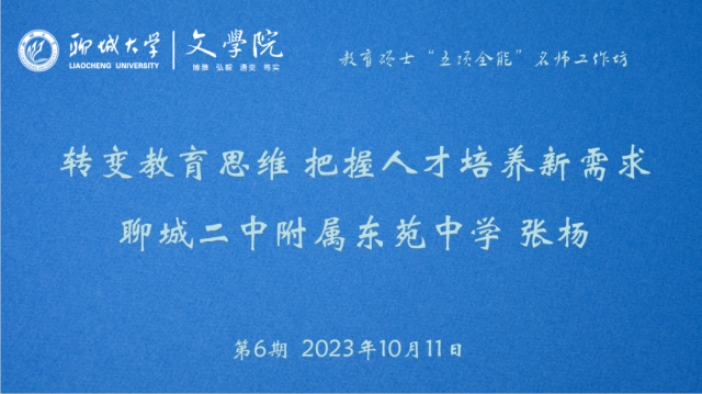 我院于10月11日特邀聊城二中附属东苑中学的张杨校长做客“教育硕士‘五项全能’名师工作坊”第6期,为2022级学科教学(语文)专业研究生做“转变教育思维,把握人才培养新需求”的主题讲座。