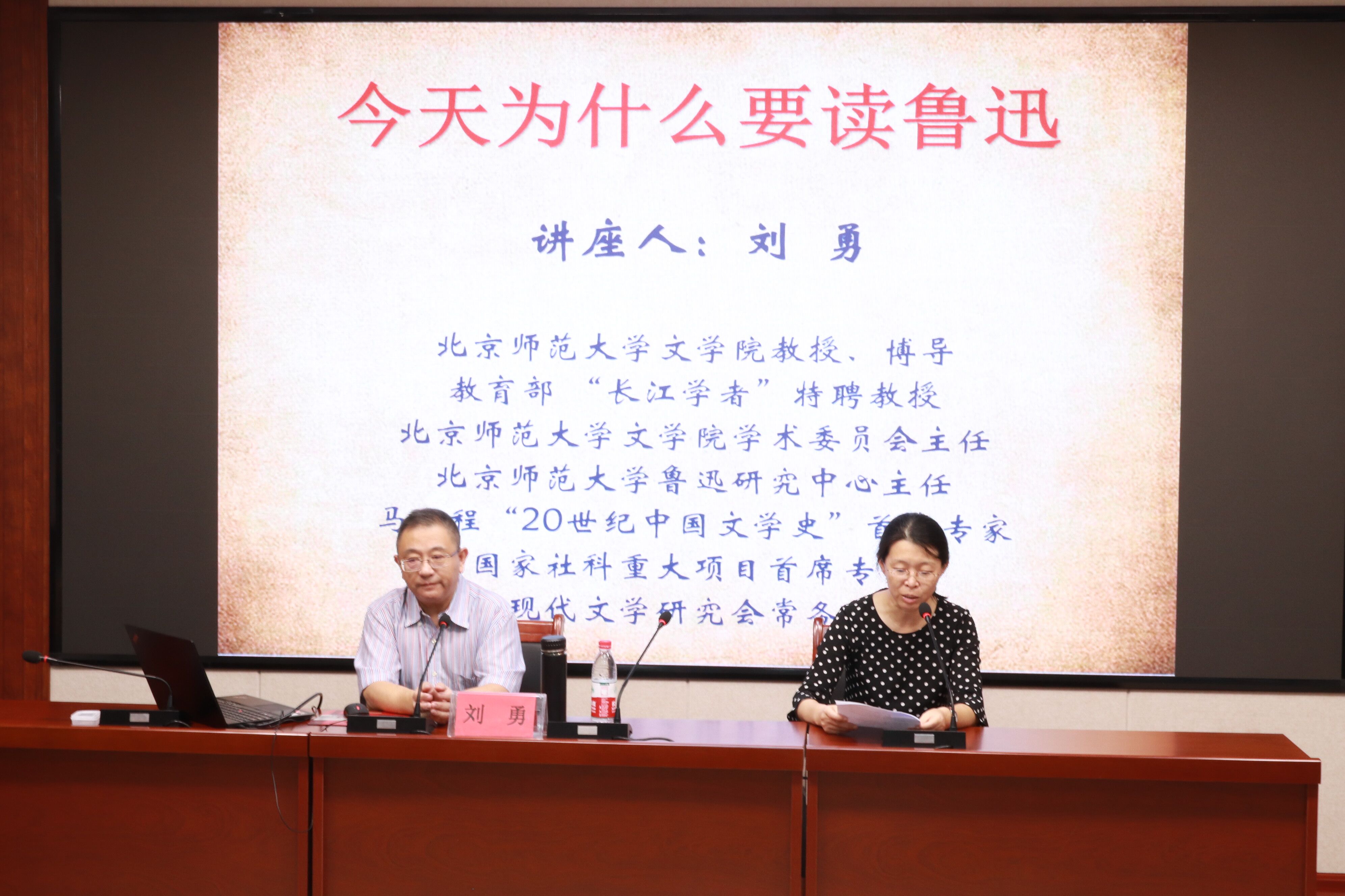 刘勇以“今天为什么要读鲁迅”为主题开启讲座。通过解析鲁迅最初的脚步,他简明而又清晰地解剖鲁迅文学:“不妨把鲁迅身上的‘光环’去掉,看一看鲁迅身上‘不好的地方’,不要把鲁迅研究成方方面面,而要从方方面面来研究鲁迅。”深入浅出、精辟独到的讲解引起了听众极大的兴趣。与会听众积极提问,刘勇以严谨治学的态度、思考问题的深邃度赢得了与会听众的强烈共鸣。短短几个小时的讲座,刘勇尽显高才博学、洽闻博见之姿,风趣的语言和渊博的学识给同学们留下深刻印象,让学生们对鲁迅先生的认识更具体、更深入,也为学生们提供阅读鲁迅作品的新视角。而后卢军提出四点建议:第一要重读唐弢《中国现代文学史》;“唐弢文作不在乎是否过时,而在于今天如何去理解它。”第二要思考今天我们要从什么角度、什么方法来研究鲁迅;第三要研究鲁迅的当下价值;第四要包容对鲁迅及其作品的不同看法,改变态度。卢军表示:“对待鲁迅既要有一颗崇敬之心,也要有一颗平常心,研究鲁迅永远在路上。”