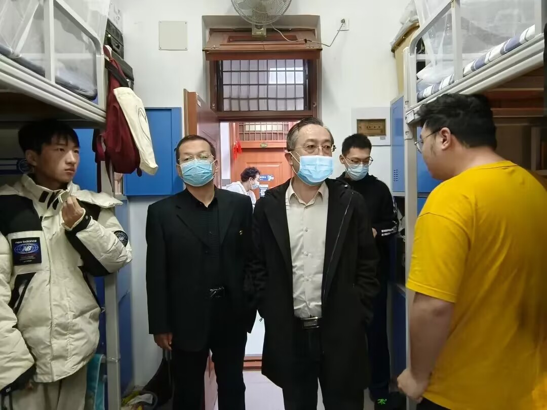 走访期间,学院领导老师与同学们亲切交谈,仔细询问同学们线上学习情况及日常生活中出现的问题,征求同学们对教师授课准备、线上教学软件、线上学习条件、饮食起居等方面的意见和建议,鼓励学生做好日程安排,合理锻炼,在提高身体素质的同时,积极配合学校线上教学安排,努力完成好特殊时期的学习任务。李承虎强调,学院师生在学习和工作过程中要做好基本防疫措施,嘱咐同学们做到以下四点:一要坚持做好疫情防控措施,克服焦虑情绪,积极配合学校各项疫情防控工作;二要在宿舍做好个人防护,坚持通风消毒;三要定期开展卫生大扫除,营造舒心的住宿环境;四要认真上好网课,确保学习质量。于东恩亲切询问大四学生的考研、考公情况,鼓励他们坚定信心,以最佳状态备考。石勇提醒同学们要笃定必胜信念,坚定必胜信心,以积极乐观的心态共同守护校园疫情防线,齐心协力打赢疫情攻坚战。