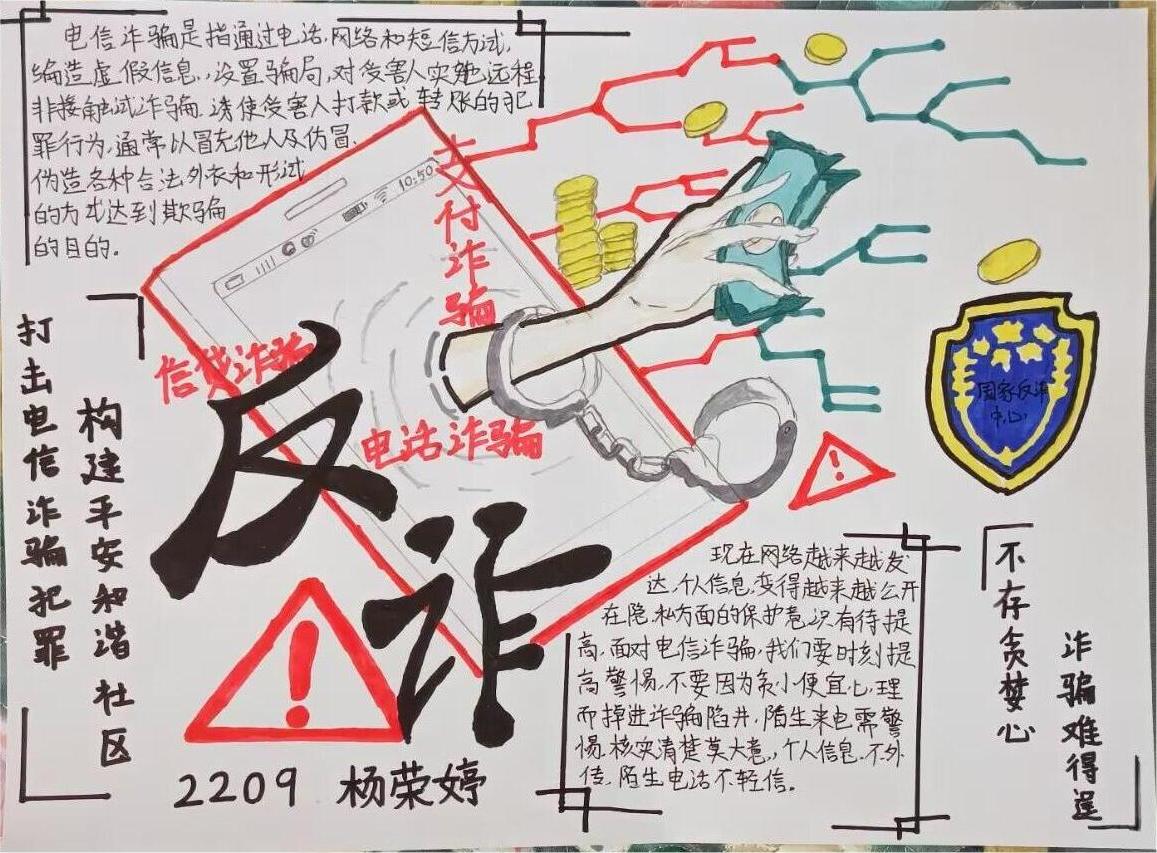 参赛学生用绘制手抄报的方式表达自身对防范诈骗的见解和对维护自身权益的看法。吕佳玉的作品构思新颖,采用“反诈日报”的创新形式,通过简洁的版面和醒目的标题对反诈知识加以强调,以生动风趣的语言引导学生们重视电信骗局。杨荣婷在作品中以金币和互联网为背景,手机屏幕外一只带着手铐紧握钞票的手,象征电信诈骗的诱惑性与危险性,突出展现当今的“互联网+诈骗”的诈骗形式,主题鲜明,设计巧妙,极具讽刺意味。李蓉蓉选用黑色和红色为主色调,凭借精妙的绘画技巧,将诈骗犯丑陋的嘴脸与电信诈骗受害者悔恨的血泪两种形象与“骗局”二字相结合,警示同学们重视网络安全。在张博雅的绘画中,“电话的另一端是鱼钩”的巧思比喻其背后的电信骗局,一则短信领取优惠券购买高额商品最终上当受骗的案例分析,更是反映出电信诈骗在我们生活中无孔不入的现状。