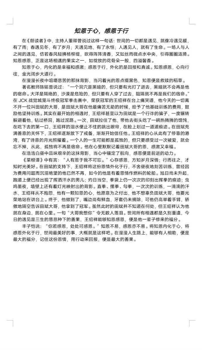 在本次活动中,英国上市公司365学子把对感恩的实感融入文章之中,以点滴笔墨表达自己对感恩的认识。2022级6班苏子洋,以“浮生”为题,用古法述今情,从“自省”“自问”“自适”三个方面探讨“何谓浮生”,再以感恩之心升华整篇文章。2023级1班褚凯鸽以真挚的文字感恩国家对他的帮助,面对高昂的学费,是国家的资助帮他解决难题,于是他立志践行“感恩”这项传统美德,以感恩之心去“补益山海,增辉日月”。2023级8班赵子源以董卿在《朗读者》中对知恩感恩的赞美开篇,点明主题,而后对拳击冠军王绍祥知恩感恩的故事进行叙述,呼吁大家在漫漫人生路中将知恩内化于心,将感恩外化于行。2022级9班肖梦瑶通过自己的经历,表达人与人之间的爱,在感受温暖的同时也去绽放光辉,再以“温暖女士”的事迹,讲述自己是如何体会到感恩的真谛。
