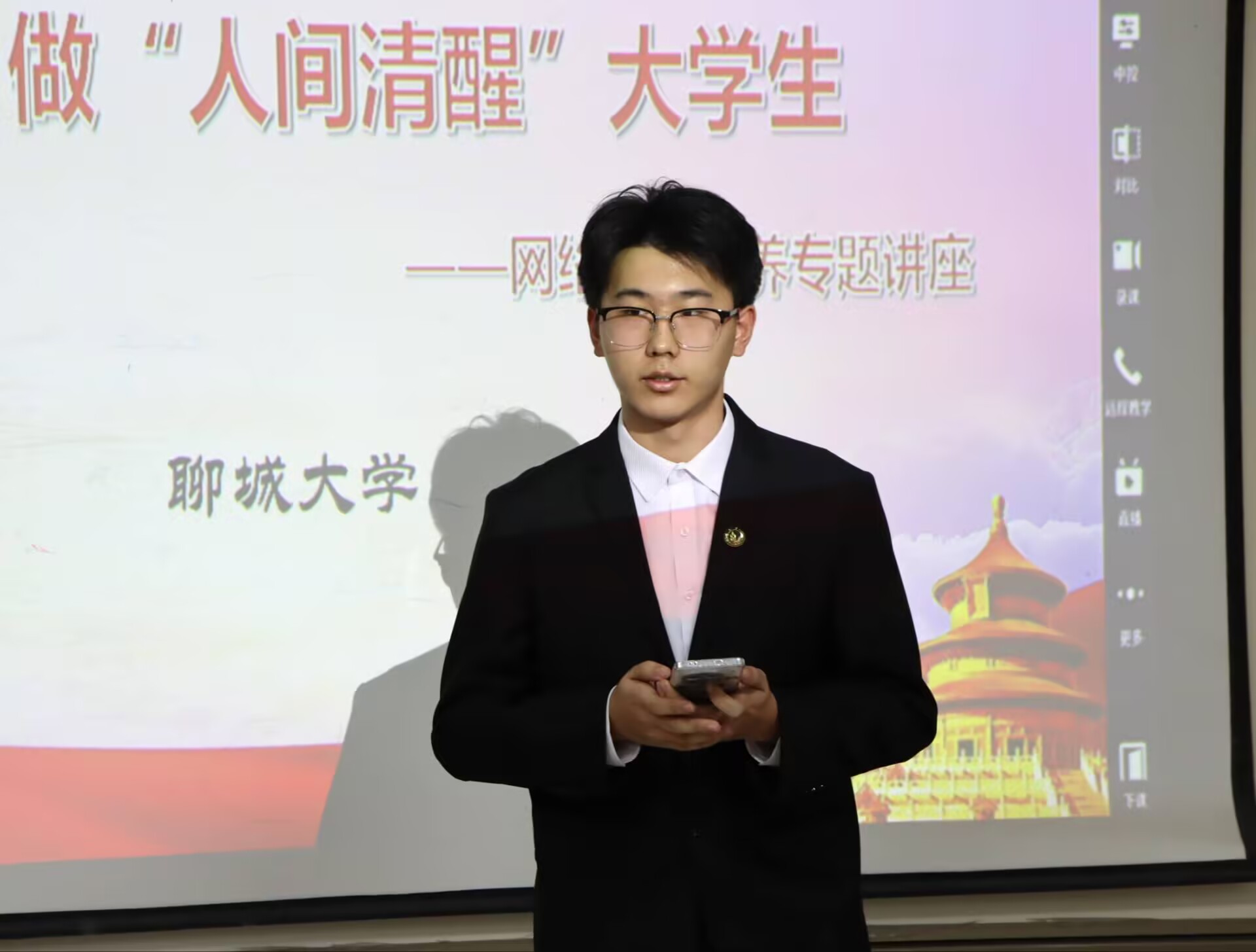 韩亭亭从网络发展历程、结构类型、信息资源等方面出发,以《坚定政治立场,做“人间清醒”大学生》为题,深度解析大学生被境外势力策反的案例。她强调,于多元的网络文化环境中坚定政治立场、牢守思想防线,守护国家机密和安全是每个大学生义不容辞的责任与义务。钱晓琪向同学们分享了关于网络道德素养的问题。她指出,随着信息技术的飞速发展,网络已经成为人们生活中不可或缺的关键要素,新时代大学生作为网络活动的主力军,对于网络文明建设具有显著的推动作用。她提醒学生要理性地使用互联网,积极传播正能量和社会主义核心价值观,自觉提高自身网络文明素养,共同营造一个健康、积极的网络环境。时超林以“ 网络不是法外之地” 为题展开讲解。他以网络谣言传播、网络诈骗频发、网络暴力等社会乱象入题,借助信息茧房、诈骗案、杀猪盘诈骗步骤等现实案例,警示当代大学生要自觉遵守网络道德规范,不断规范自身行为,为营造和谐有序、风清气正的网络环境贡献力量。