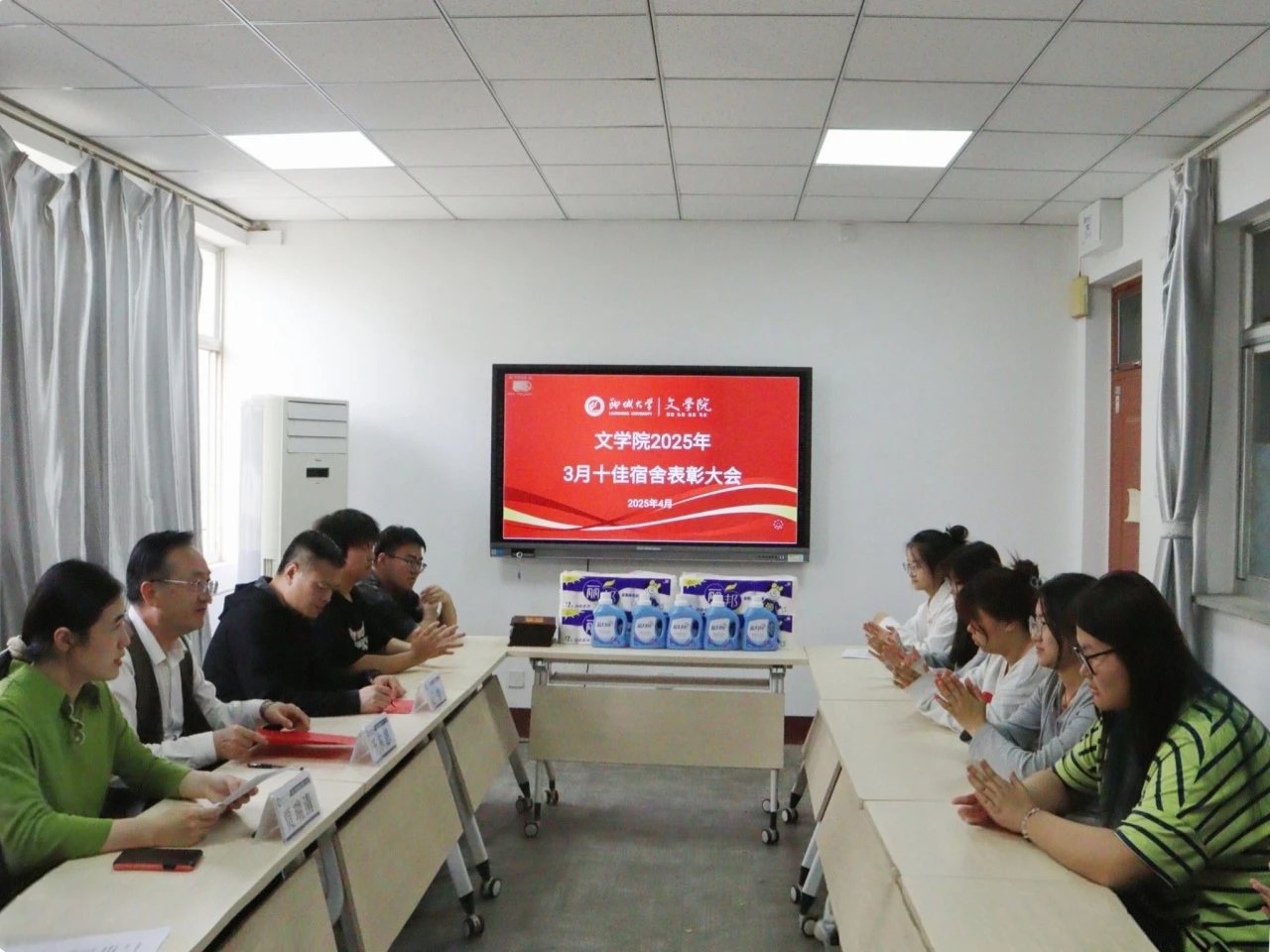 优秀宿舍表彰大会现场,于东恩与石勇共同为获奖宿舍颁发奖状及生活用品,表彰其在宿舍管理、文化建设等方面取得的优异成绩。优秀宿舍代表积极分享在宿舍生活中的宝贵经验,赵可仪着重分享宿舍文化建设心得感受,通过定期举办读书分享会等形式,增强宿舍成员之间的凝聚力和归属感;李志伟从宿舍管理入手,表示规则与包容缺一不可,相互体谅才能关系融洽。