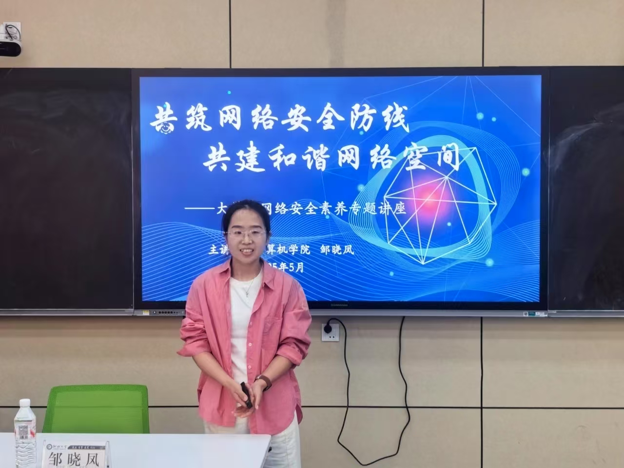 邹晓凤以“共筑网络安全防线,共建和谐网络空间”为题,结合典型案例,深入剖析当今网络环境,带领同学们认识个人信息泄露、虚假新闻、网络诈骗、恶意谣言等网络陷阱的危害。邹晓凤提到,在互联网飞速发展的今天,网络已深度融入我们的日常生活、学习与工作中,网络安全不仅是个体安全的问题,更是国家安全和社会稳定的重要保障。随后,她详细介绍网络安全的概念以及维护网络安全的重要性,解读网络安全对国家安全的意义,强调其在科技创新、经济安全和社会稳定等方面的重要作用。此外,邹晓凤结合《中国互联网发展状况统计报告》的最新数据分析大学生网络安全素养现状,指出大学生在网络使用中存在网络安全意识薄弱、网络安全知识匮乏等问题,通过大量真实、生动的案例细致讲解网络病毒攻击、“共享屏幕”诈骗等网络安全常见隐患,从树立网络安全意识、规范网络安全行为、提高网络实践能力等多个维度,为同学们传授提升网络安全素养的实用方法,分享预防网络诈骗小技巧,帮助同学们在网络世界中筑牢安全防线。最后,她鼓励同学们积极参加校园网络文化活动、网络安全竞赛等,切实提高网络实践能力,为构建和谐清朗的网络环境贡献力量。