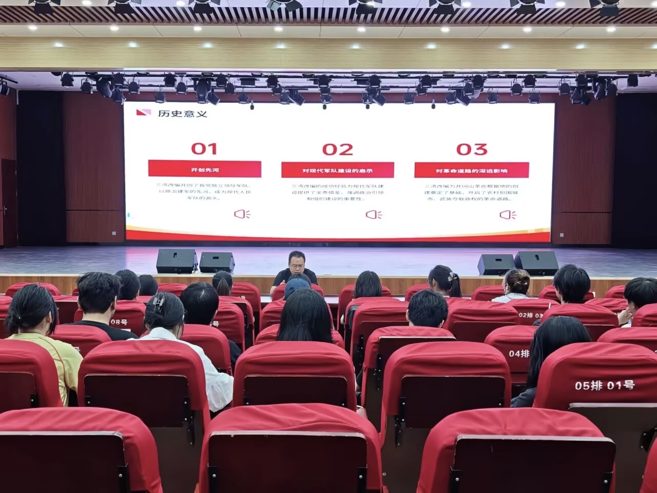 活动伊始,纪楠老师以“革命薪火代代相传”为主题,深入解读《三湾改编》的历史纵深与现实意义。他指出,影片不仅全景式展现毛泽东同志“把支部建在连上”的治军智慧,更通过余洒度、苏先骏等立体群像,深刻诠释"人民至上"的价值底色。影片《三湾改编》全景式再现1927年秋收起义部队在三湾村的涅槃重生,以极具张力的镜头语言展现革命先驱在生死存亡之际的抉择,于血火淬炼中铸就人民军队的永恒军魂。观影结束后,学生代表围绕影片精神展开热烈研讨。2024级2班赵书伟从军事现代化转型视角,系统阐释“思想建党、政治建军”原则的历史必然性,呼吁当代青年以史为鉴,在民族复兴征程中续写"三湾精神"的时代篇章;2024级10班沈政均聚焦“支部建在连上”的建军创举,结合恢弘战争场景分析理想信念的精神内核,激励青年一代从红色血脉中汲取前行力量。