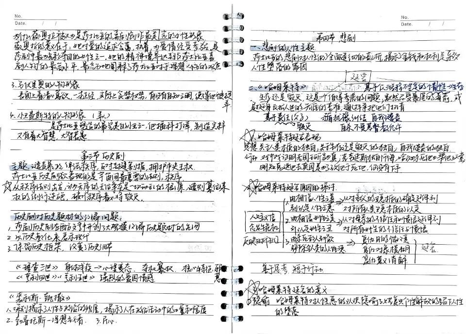 学习笔记留下学习的痕迹,记录着获取知识的瞬间,本次活动评选出学生认真记录的笔记,肯定其严谨奋进的学习态度。2022级3班王智阳的外国文学史笔记内容详实,指出悲剧《哈姆雷特》中延宕手法的表现,并对其成因进行深入探索,同时,采用符号标记考察重点,使难点要点清晰可见。2022级6班高晓雪运用不同标注符号,提纲挈领地从修辞、用词和音律等方面解析诗歌,积累诗文赏析的技巧要点,通过研究黄庭坚生平,进一步知人论世,加深对黄庭坚诗歌的理解与把握。2022级8班王海祎的古代汉语笔记字迹清晰,内容丰富,详细地记录古文常用字的释义以及相关文学常识,加强对专业知识的理解记忆,有效提高学习效率。2023级3班郭容瑄的现代文学笔记思路清晰,灵活运用多样的符号元素理清不同事件之间的联系,鲜明的色彩标注使得重点考点更加醒目突出。2023级9班谷依霖的笔记字迹工整,条理清晰,点出新闻报道两大要求以及每一条要求中的具体要点,序号化的记录将笔记划分成不同层次,便于之后的回顾复习。2023级10班姜昶辰利用思维导图展现对现代汉语中文字概说的理解,从文字的性质、汉字的起源、特点以及作用四方面入手,着重记录了汉字的特点,系统把握现代汉语中有关文字的相关知识。