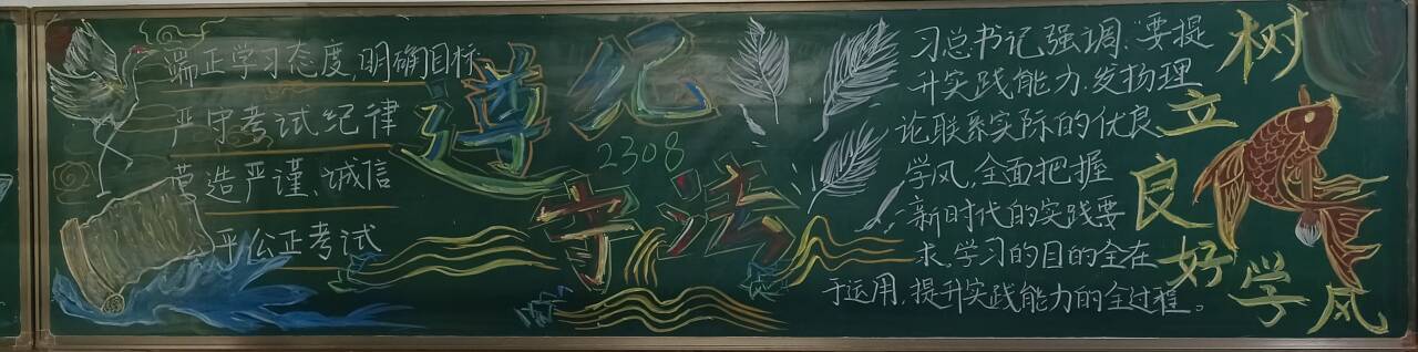 2023级各班同学积极参与,集思广益,利用课余时间绘制出一幅幅主题鲜明、图文并茂的精美板报。2023级1班的黑板报整体简约工整,将书本上的"考试"二字作为画面的主体,鲜明彰显活动主题,黑板两侧文字聚焦考风建设的目的和意义,强调学风建设的重要性,引导同学们自觉遵守考试规则,诚信考试。2023级2班的黑板报风格活泼可爱,中间"严肃考风考纪,树立优良学风"主题突出,板报间点缀"严谨"、"务实"、"诚信"等字样,体现对同学们的期望与要求,"逢考必过"寄予着同学们的美好祝福。2023级5班的黑板报着重突出考前注意事项,提醒同学们放平心态,端正态度,沉着冷静面对考试,绘画部分以课本为主要素材,呼应考试主题。2023级8班的黑板报色彩鲜明,设计独特,右下方鲤鱼跃龙门元素,预祝同学们旗开得胜,勇得佳绩。2023级9班的黑板报引用孟子的名言"诚者,天之道也;思诚者,人之道也。"督促同学们遵守考试纪律,让舞弊远离校园,让诚信永驻心中。