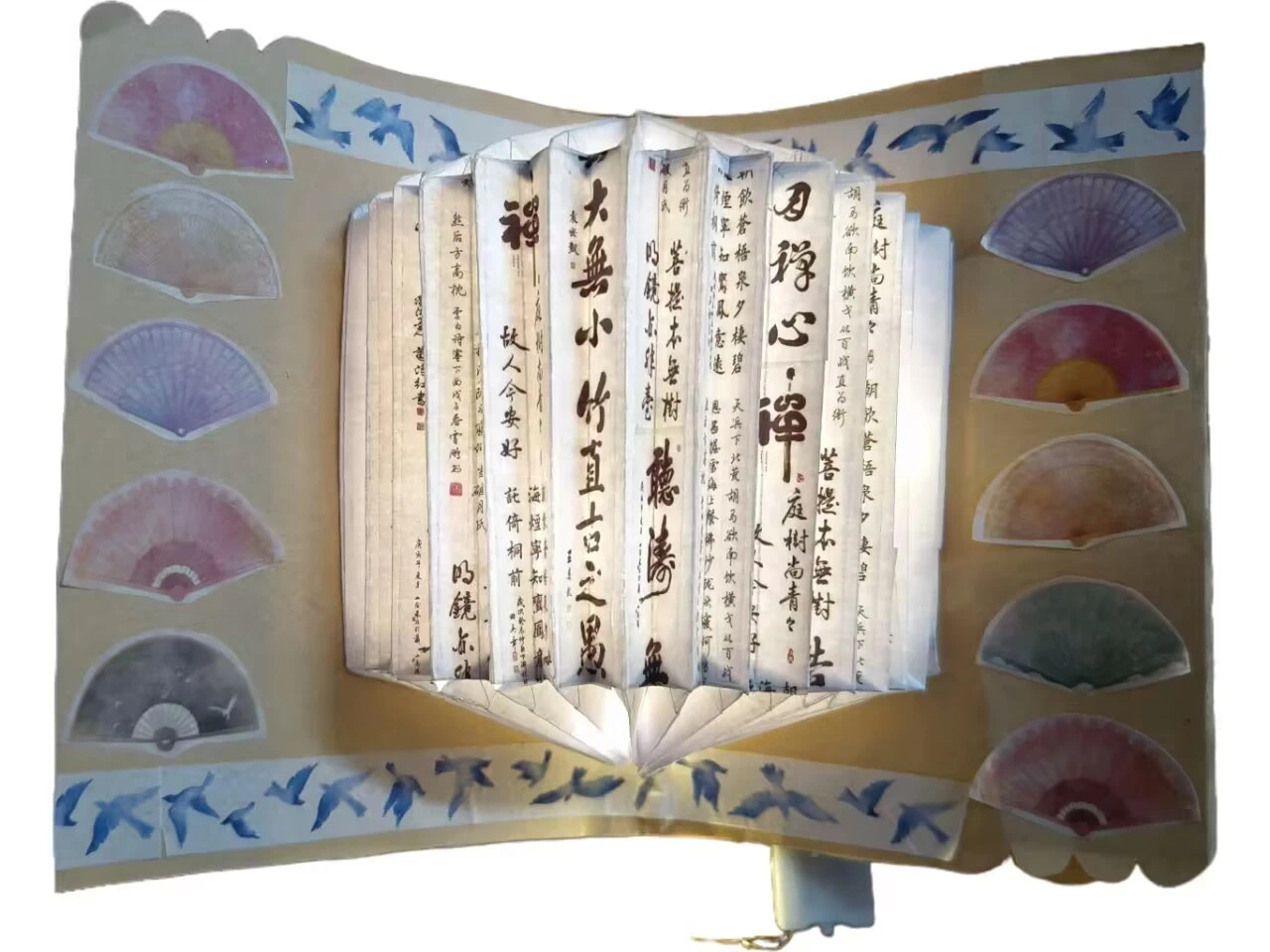 牛皮纸下灯亮起,手作体验暖意生。活动伊始,主持人播放视频介绍纸书灯的历史与制作方法,并为同学们发放材料。同学们亲自动手,选取材料,交流想法,发挥创意,制作出一盏盏富有独特魅力和文化内涵的纸书灯。2021级1班潘春竹将传统中国元素与山水国画元素结合,又以精致的流苏和翩翩起舞的蝴蝶作为点缀,展现出国风版纸书灯的如诗如画。2022级2班刘奕彤将传统中国扇子元素与中国诗词结合,又以大雁贴纸作为点缀,展现出国风扇形书灯的美轮美奂。2022级3班王慧琳将王羲之的《兰亭集序》写入书灯,一笔一画,挥毫泼墨,将蝴蝶、古风贴纸作为装饰,通过对折、剪裁、粘贴等步骤,让蝴蝶与光影跳动于书灯之上。2022级6班高晓雪将中国汉字与灵动的蝴蝶相对应,让汉字与蝴蝶跳跃于纸张之上。点亮书灯,带来的不仅是明亮与温暖,更是中华优秀传统文化的传承与延续。