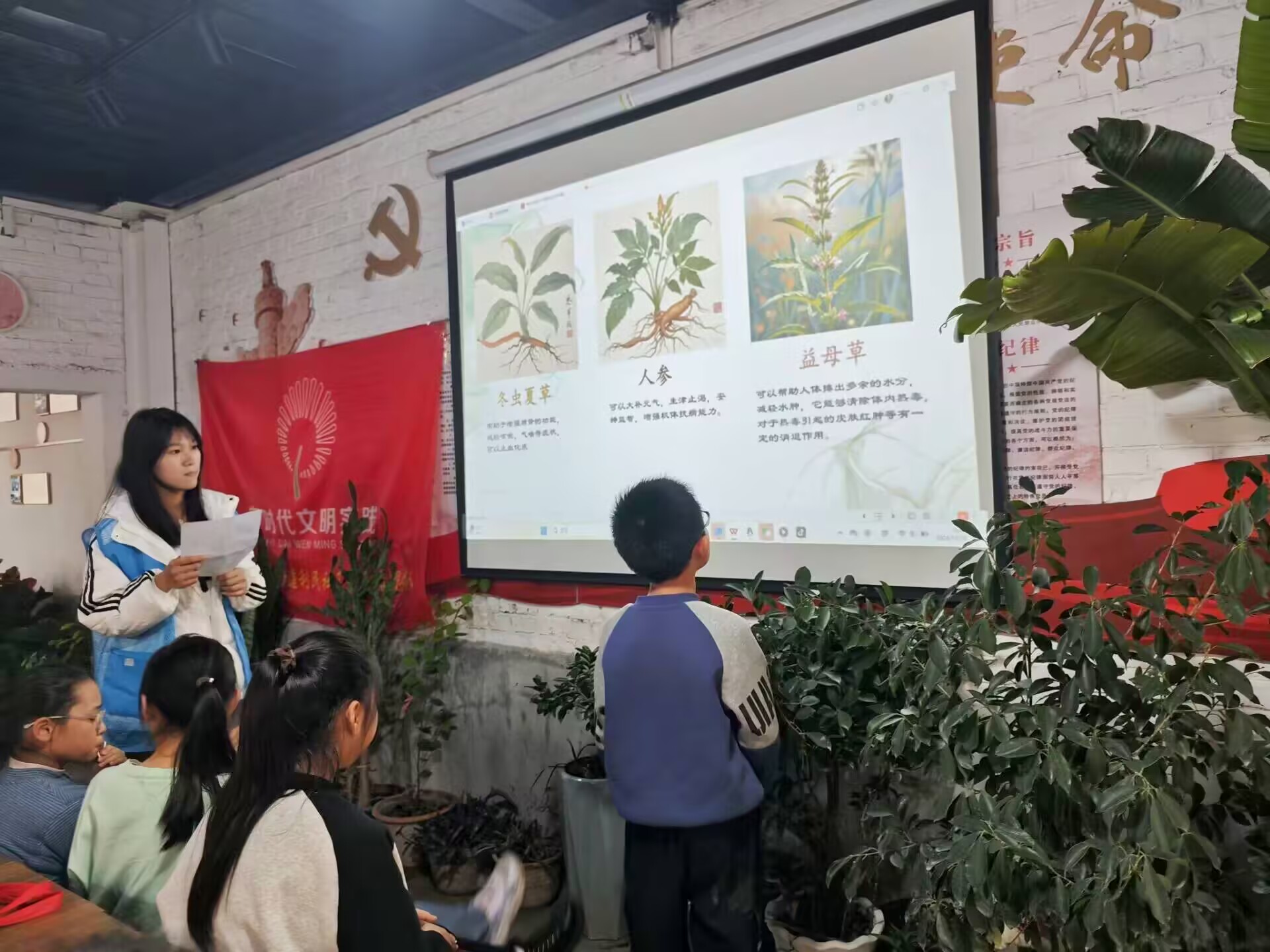 活动现场,志愿者通过生动有趣的 PPT 向同学们介绍了中医“治未病”、阴阳平衡、顺应四时等养生理念,牢牢抓住孩子们的目光,带领他们推开中医文化世界的大门,领略其中的独特魅力。志愿者在讲解饮食养生、运动养生、情志养生等中医养生门道时设置了问答和小组讨论环节,孩子们纷纷举手抢答、积极讨论,交流自己在日常生活中喝杂粮粥、饭后散步、睡前冥想等中医养生小妙招,你来我往间的气氛热火朝天,大家也在思维碰撞中悄然洞悉中医养生的深层奥秘。志愿者们将精心准备的中药卡片分发给每个小朋友,并介绍卡片中药材在生活里的“大作用”,例如枸杞配菊花清肝明目、薏米除湿气助运化等,激发孩子们对中药的浓厚兴趣。在课堂的最后,志愿者引导孩子们动手画出他们最喜欢的中药,并和大家互相交流,这让他们在互动中收获友谊,更增强他们对中药的认识与探索热情。