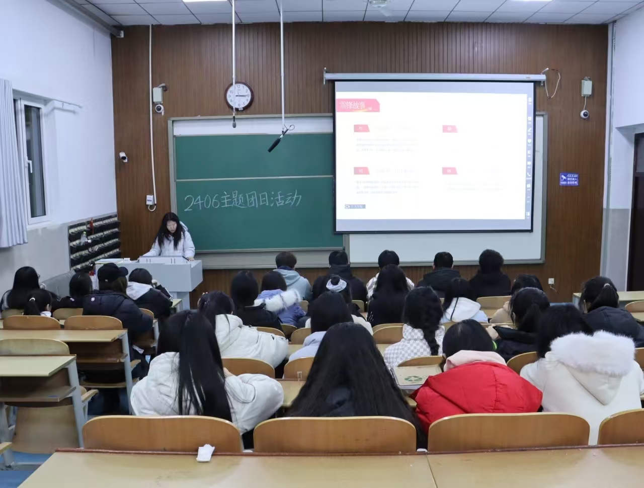 宣讲人胡佳琪以纪录片《雷锋是谁》为切入点,生动展现雷锋同志从艰苦童年到敬业奉献的人生历程,深刻阐释“为人民服务”的精神内核。随后,她结合典型案例,从不同角度塑造鲜活、正义的雷锋形象,系统解读雷锋精神的时代内涵,指出其核心在于奉献精神、“钉子”精神、“螺丝钉”精神与艰苦奋斗精神的统一。在场学生凝神聆听,纷纷表示深受触动。在交流讨论环节,学生围绕“新时代如何践行雷锋精神”展开热烈讨论,一致认为应从日常点滴做起,以严谨态度对待学业,以真诚之心服务他人,积极参与校园志愿服务,在实践中学以致用。活动尾声,全体学生庄严肃立,齐声诵读雷锋箴言,铿锵有力的话语激励着全体学生以实际行动践行新时代雷锋精神,也传递出新时代大学生的使命与担当。