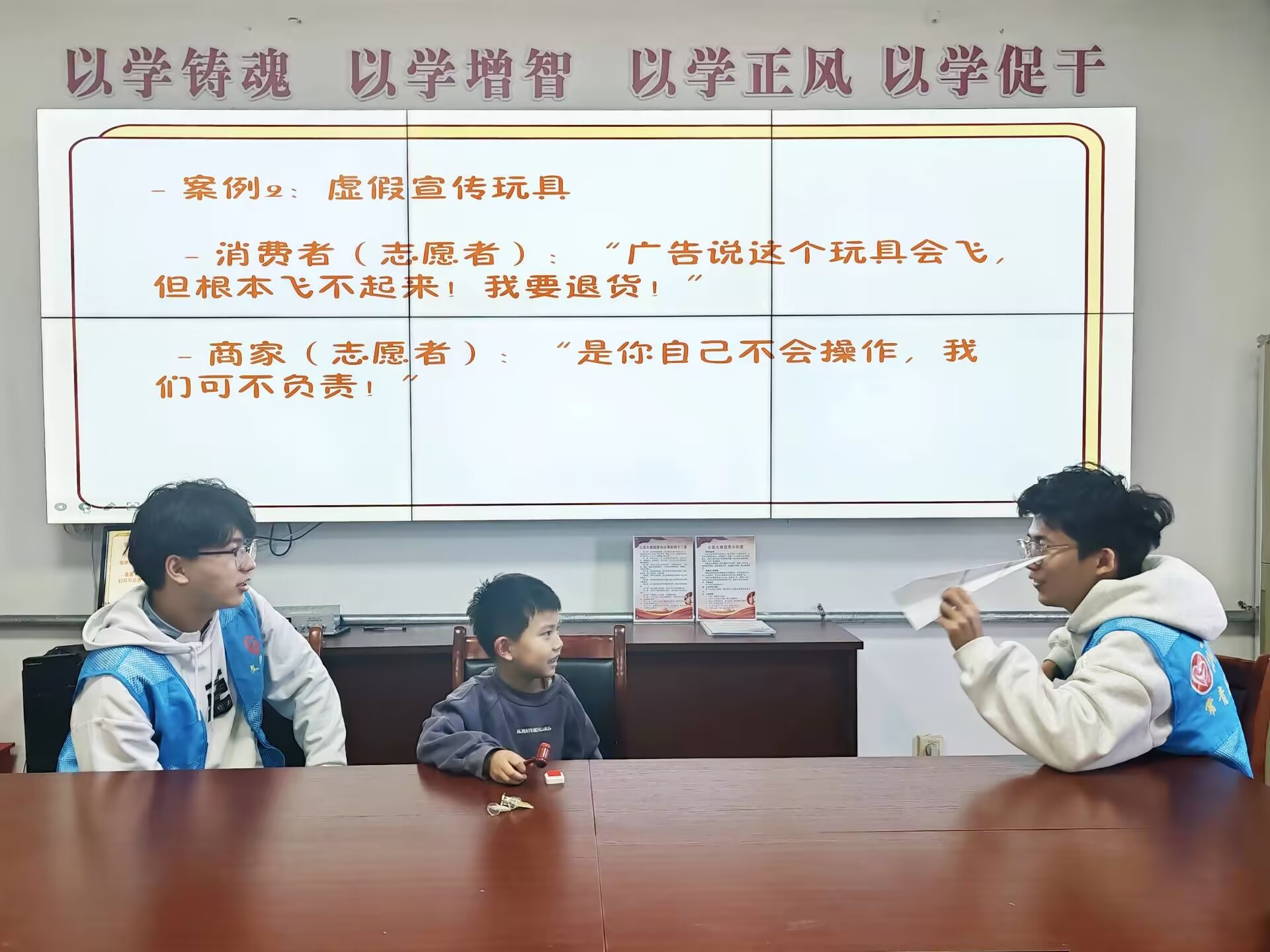 活动伊始,志愿者通过展示生动有趣的动画短片和漫画图解,围绕“安全保障权”“知情权”“自主选择权”等主题,细致宣讲《消费者权益保护法》内容,帮助儿童了解维权途径,学会用法律维护自身合法权益,孩子们认真倾听、积极提问,志愿者依次解答。角色扮演环节中,志愿者模拟买卖合同纠纷场景,让孩子们在亲身体验中深刻加强法律认识。创意手工环节中,志愿者通过绘画与手工创作形式表达对健康消费环境的理解,细心引导孩子们使用绘画工具等材料,大胆发挥想象力来表达自己的创意思维与构想。最后,志愿者为孩子们颁发证书,鼓励孩子们保持积极向上的心态,勇敢维护自身的权益。