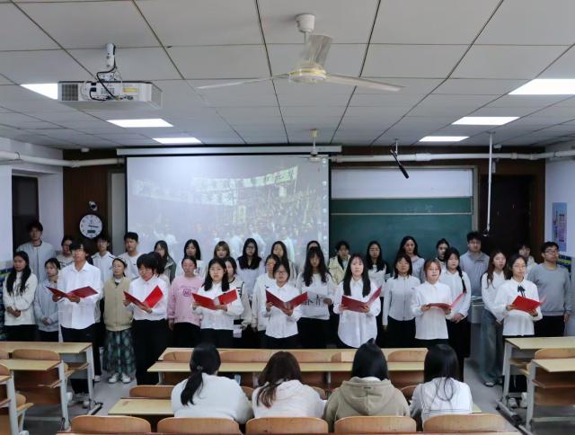 2024级2班全体同学在肃穆的视频背景下齐声高呼“还我河山!”,以饱含情感的朗诵讲出那段悲痛的历史,深刻还原了先辈们的爱国情怀、民族气节和抗争精神。朗诵最后,同学们振臂宣誓:“让青春在时代洪流中熠熠生辉,让梦想在祖国大地上开花结果!”将历史记忆与当代担当紧密联结,彰显红色基因的传承力量。