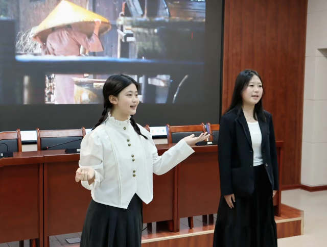 掌心的纹路藏着山河的记忆,聚拢永不熄灭的光。地理与环境学院段开以沉稳而温润的嗓音,将《我用残损的手掌》娓娓道来。他怀揣赤子情怀,诉说国土疮痍,深情歌颂“永恒中国”带来的爱与希望。“因为只有那里是太阳,是春,将驱逐阴暗,带来苏生……那里,永恒的中国!”末段每一句吟咏,尽显对祖国的深沉的爱。