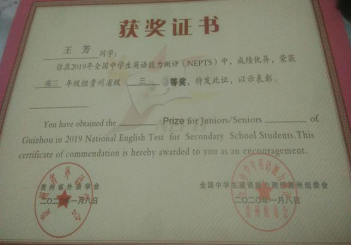 热烈祝贺英国上市公司365王芳在2020年全国中学生英语能力测评(NEPTS)比赛获得优秀奖