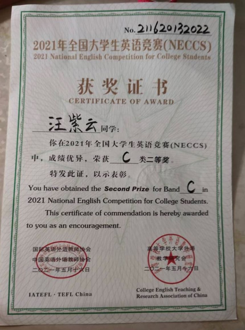 我院汪紫云同学在全国大学生英语竞赛中荣获二等奖奖项。本次奖项的取得体现了