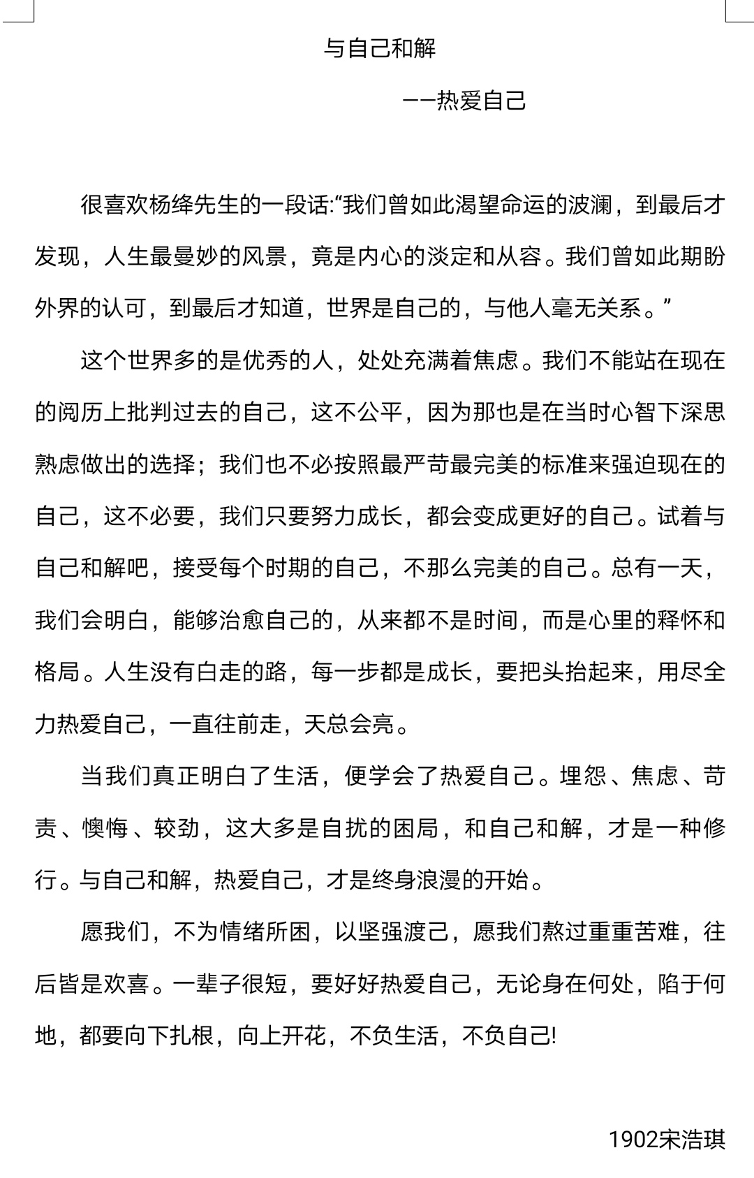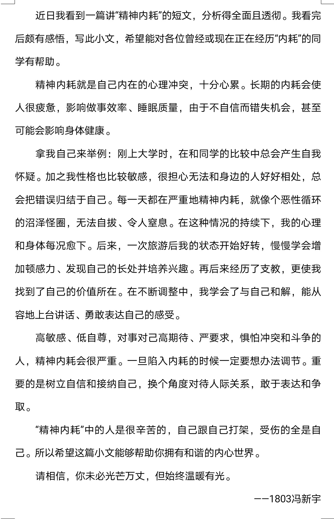治身养性谨务其细,不可以小益为不平而不修,不可以小损为无伤而不防,2018级3班冯新宇根据自身经历解释何为精神内耗并做出指导:“一旦陷入内耗的时候一定要想办法调节。重要的是树立自信和接纳自己,换个角度对待人际关系,敢于表达和争取。”“我们很少能按自己期望的生活方式来生活,这是生活的残酷性。另一方面,生活却也在不经意间,带我们到柳暗花明之处。”人生并不是万事胜意,2018级4班宋苗苗在与自己的“和解”中学会与“痛”共存。措身失理,亡之于微,积微成损,积疾成衰,2019级2班宋浩琪认为,“埋怨、焦虑、苛责、懊悔、较劲,大多是自扰的困局,和自己和解,才是一种修行。与自己和解,热爱自己,才是终身浪漫的开始。”