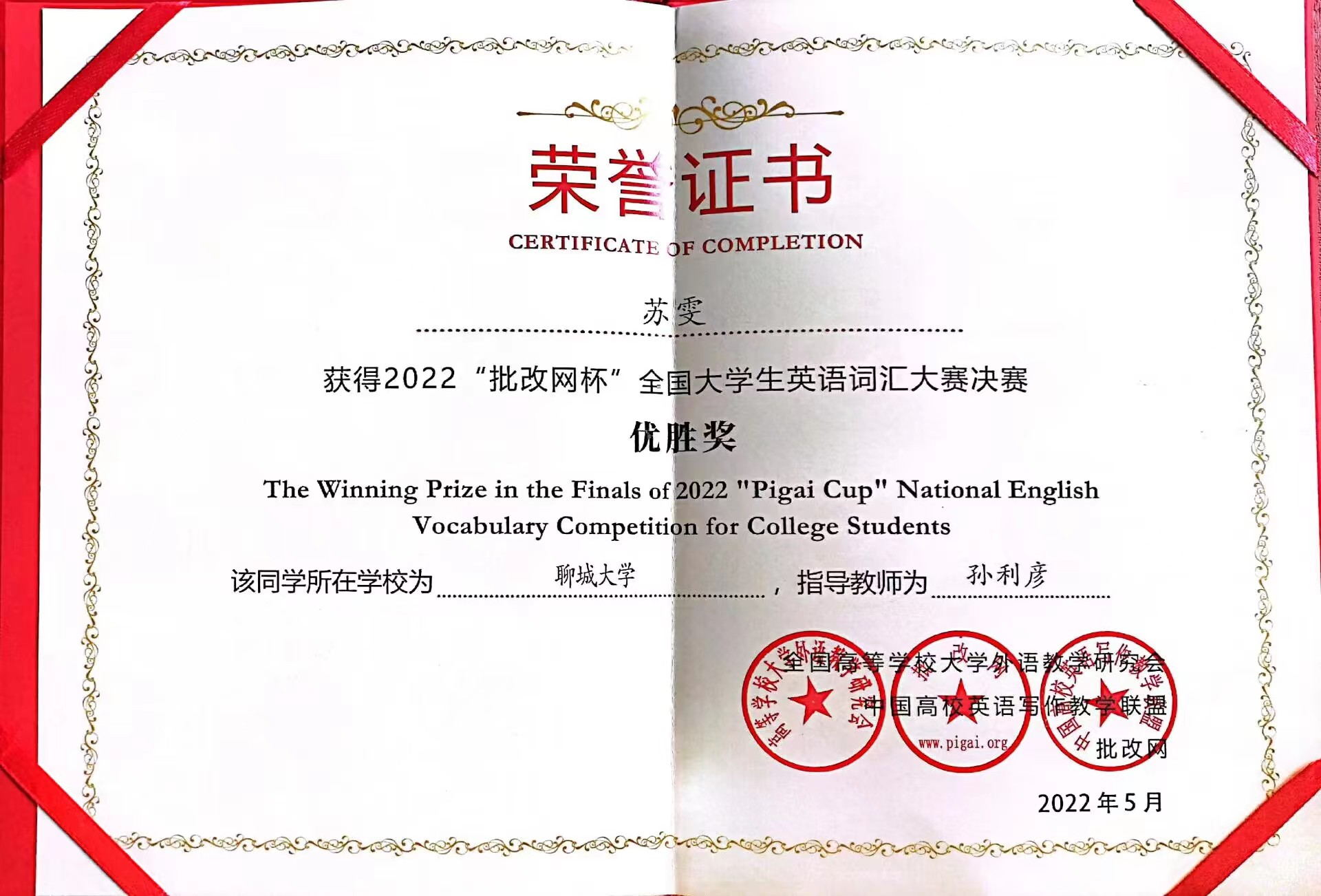 我院苏雯同学荣获2022“批改网杯”全国大学生英语词汇大赛三等奖。此次获奖充分展现了苏雯同学在日常学习生活中的不懈努力,我校为有这样的学生而感到骄傲。在此,向苏雯同学表示诚挚的祝贺,同时祝愿她乘风破浪,再获佳绩。