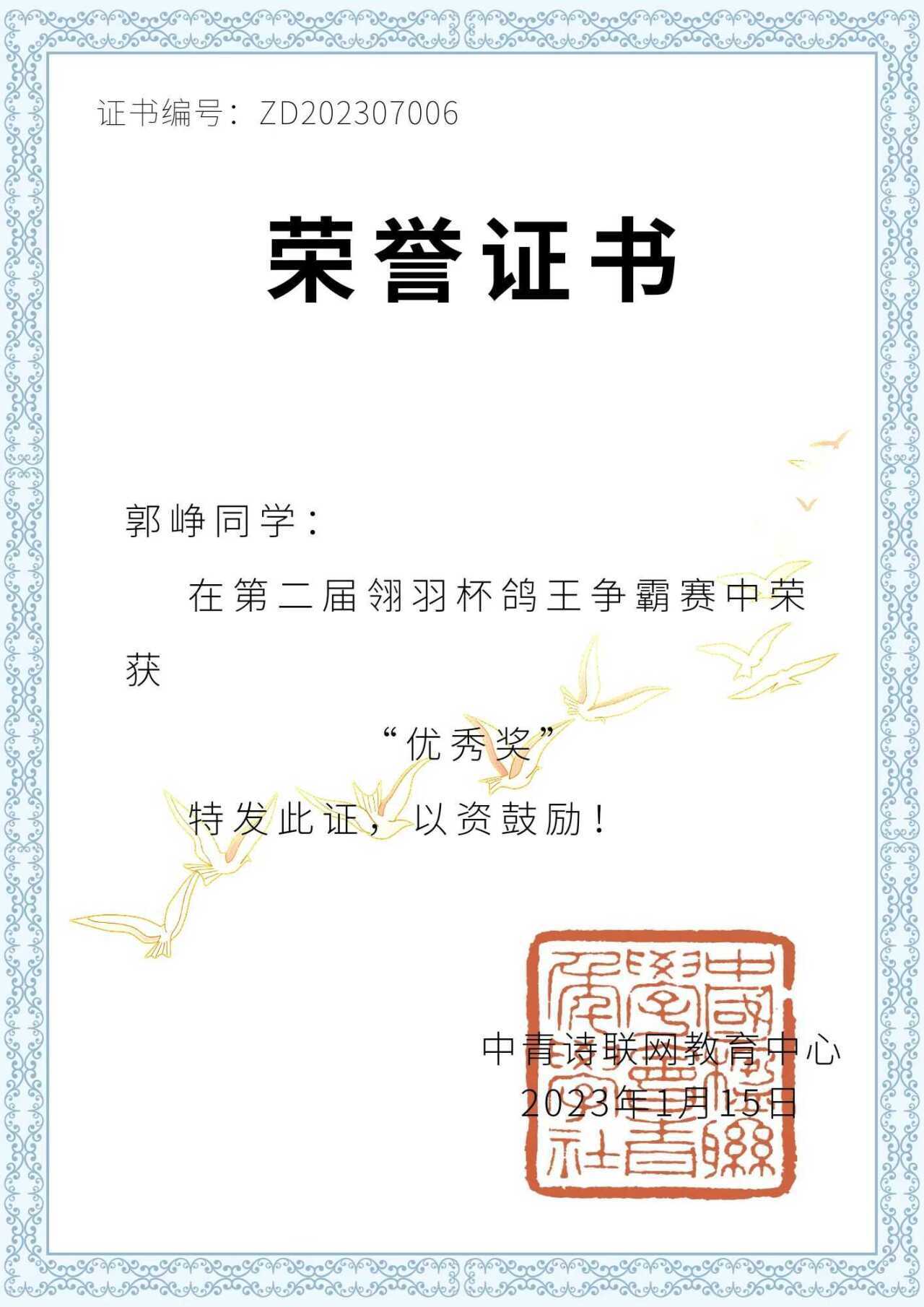 热烈祝贺英国上市公司365郭峥同学荣获第二届“翎羽杯”鸽王争霸赛优秀奖