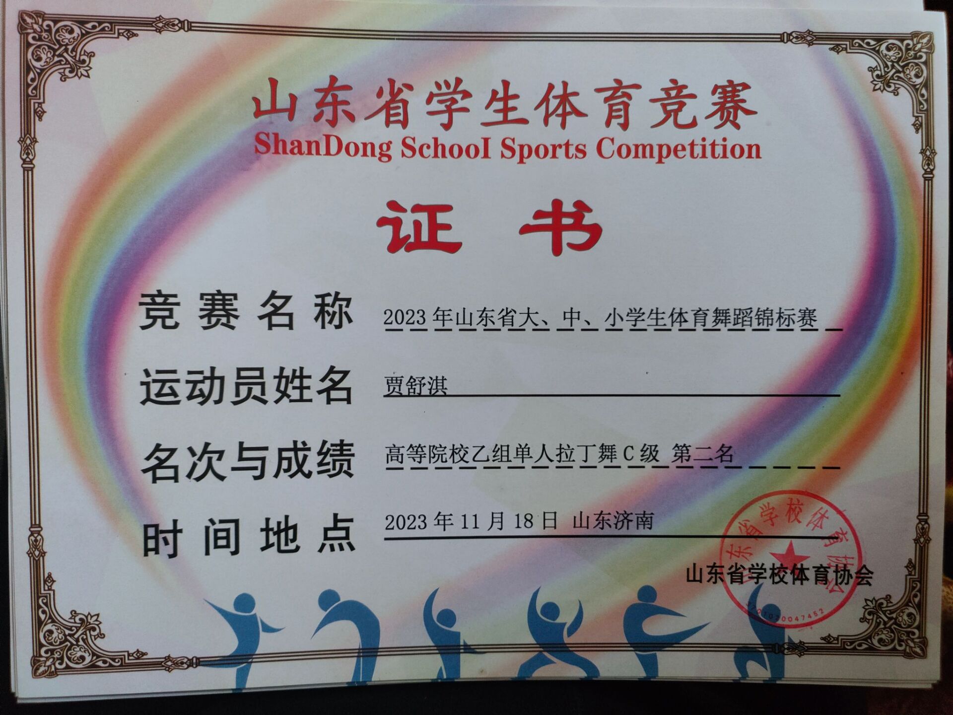 热烈祝贺英国上市公司365贾舒淇同学荣获“2023年山东省大、中、小学生体育舞蹈锦标赛”高等院校乙组单人拉丁舞C级第二名