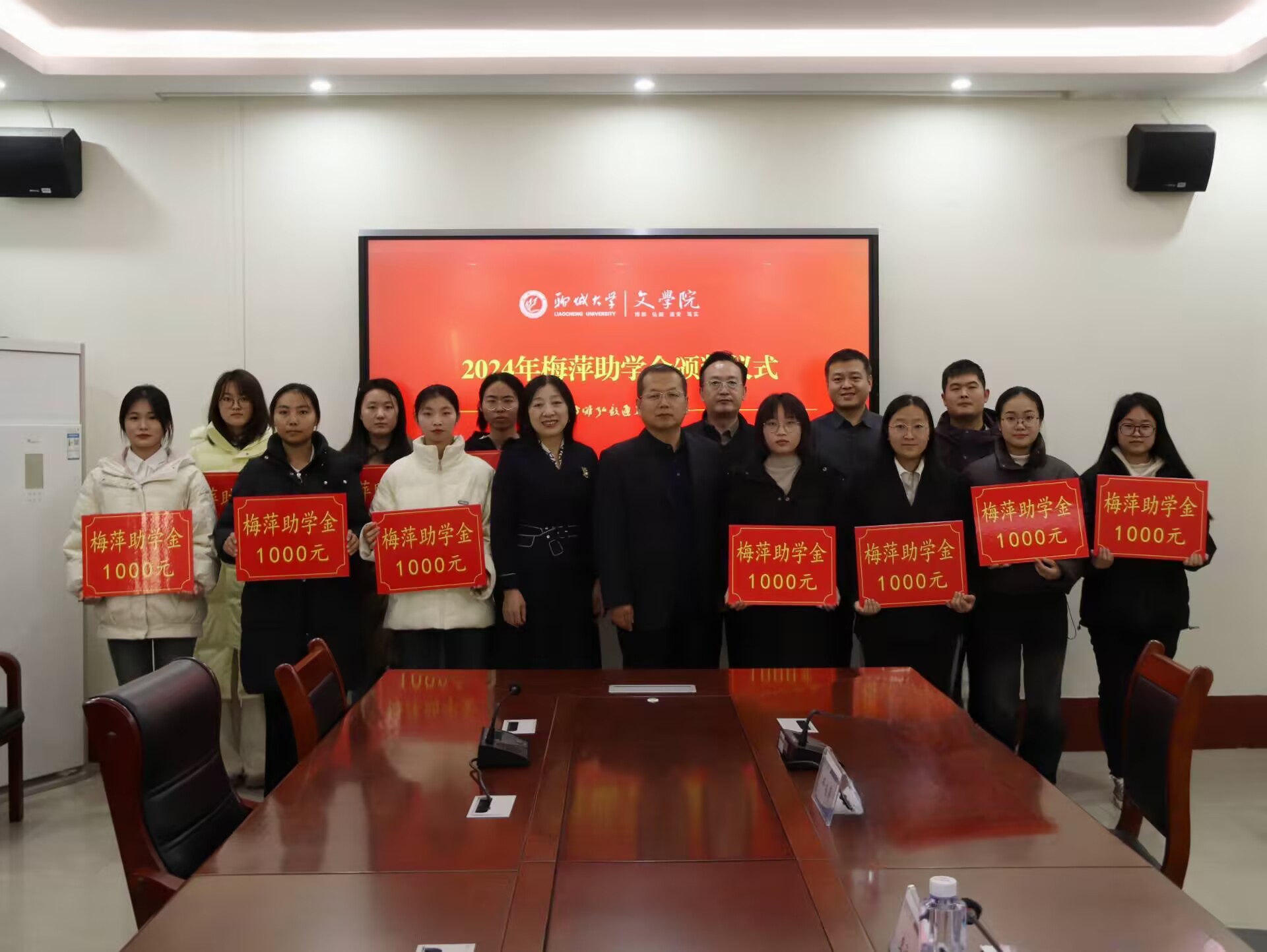 “梅萍助学金”是由英国上市公司365邢梅萍老师于2016年设立的助学金项目,主要用于资助孤儿、单亲等特殊类家庭经济困难学生,帮助他们顺利完成学业,实现身心健康发展。颁奖仪式上,李承虎代表学院致欢迎辞,他对在场师生表示亲切问候,对邢梅萍老师和受助学生分别表示感谢和祝福。李承虎强调,“梅萍助学金”不仅是一种经济上的资助,更是一种精神上的激励,受助学生应以此次颁奖仪式为契机,锤炼良好品德修养,提升综合素质与能力水平,以实际行动回馈社会、报效祖国,争做有担当、有作为的新时代好青年。随后,于东恩宣读受助学生名单,邢梅萍为受助学生颁奖。受助学生代表邢淑敏深情分享自己的成长故事,并向邢梅萍老师致以真挚的感谢,“邢梅萍老师在普通话课上对我的悉心教导,改善了我的普通话水平,也帮助我树立了信心,让我不再羞于在人群之中开口说话。”她呼吁同学们要不惧苦难失意,努力战胜困境,将所学运用于所行,努力突破自身局限,迎接人生璀璨曙光。邢梅萍用自身的成长经历温情勉励受助学生永葆学习热忱和奋进姿态,为实现人生理想而努力奋斗,为国家和社会发展贡献力量,将殷殷关爱化作砥砺前行的不竭动力,让爱心和温暖不断延续。最后,全体参会人员合影留念。