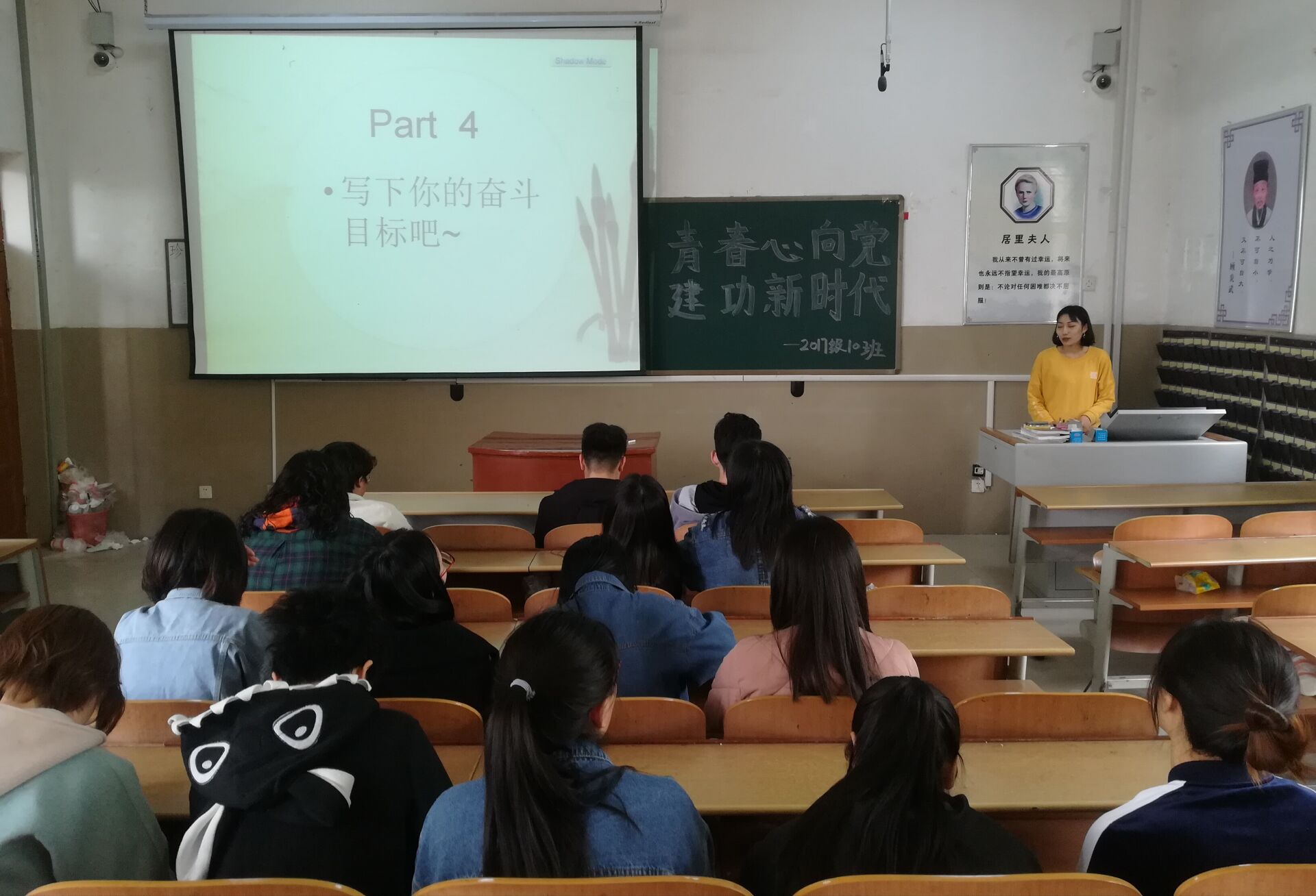 准备期间,各宿舍积极查阅相关资料,了解关于五四爱国运动的相关知识。活动伊始,全体同学共同观看《厉害了我的国》影片,结合专业知识,理解、分析影片内涵。观看结束,由负责人马非凡记录,各宿舍之间展开激烈的知识竞答环节。竞答过程中,同学们查漏补缺、受益匪浅,对历史上的这段光辉岁月有了更深的认识。随后,各宿舍依次向同学们推荐红色书籍或讲述一段历史人物故事。杨瑞敏以素描画的形式表达对祖国日益强大的自豪感,张晓蝶则带领同学们重温《钢铁是怎样炼成的》中的坚韧、自强的宝贵品质。最后,全体同学写下自己的奋斗目标,进行集中展示,激励进步。