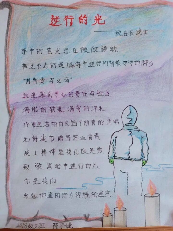 疫情就是命令,防控就是责任。此次活动采用线上活动方式,活动前期,2018级5班“小绿萝”分队做了充分的宣传工作,保证每名同学都能参与其中。活动期间,有的同学选择叠千纸鹤给抗击疫情的英雄们,并在上面写一句原创疫情防控标语,铭记奔赴前线与疫情抗争的模范先锋与光荣事迹;有的同学选择为疫情防控期间始终奋斗在一线的医护人员们写一首赞美诗,表达对他们深深的崇敬和感恩之情;有的同学选择观看纪录片《英雄之城》,并互相交流心得体会,谨记疫情期间辛苦付出的抗疫英雄。同学们根据兴趣自由选择活动方式,讲述自己的疫情防控故事,大家以宿舍为单位,共同协作完成每一个小活动,最后作品汇总提交。