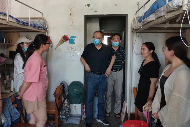 在充分做好消毒杀菌与常规检查工作后,苗菁和于东恩一行来到学苑二与紫藤八公寓,对大四年级毕业生宿舍进行走访。老师们对顺利返校学生表示欢迎,与学生亲切交谈,详细询问返校过程、居家在线学习情况,以及到校后的生活安排、毕业打算等。“考研结果怎么样啊?有没有和舍友们一起好好秉烛夜谈,说说体己话啊?”来到每个毕业生宿舍,老师们都亲切地和同学们打招呼,在即将离开校园的时候能再见到曾经朝夕相伴的老师们,同学们的脸上满是喜悦和不舍。一位同学表示,宿舍五人考研,五人上岸,老师们听后十分欣慰,并表示,希望同学们毕业后也继续秉承“博雅弘毅堪任重,通变笃实以致远”的院训,在人生之路上走的更远、看的更高。在关心同学们的学习和生活近况的同时,老师们还嘱咐同学们,当前疫情防控进入常态化阶段,但由于学校本身具有人员较为密集的特点,希望同学们认真遵守学校规定,积极做好个人防护。