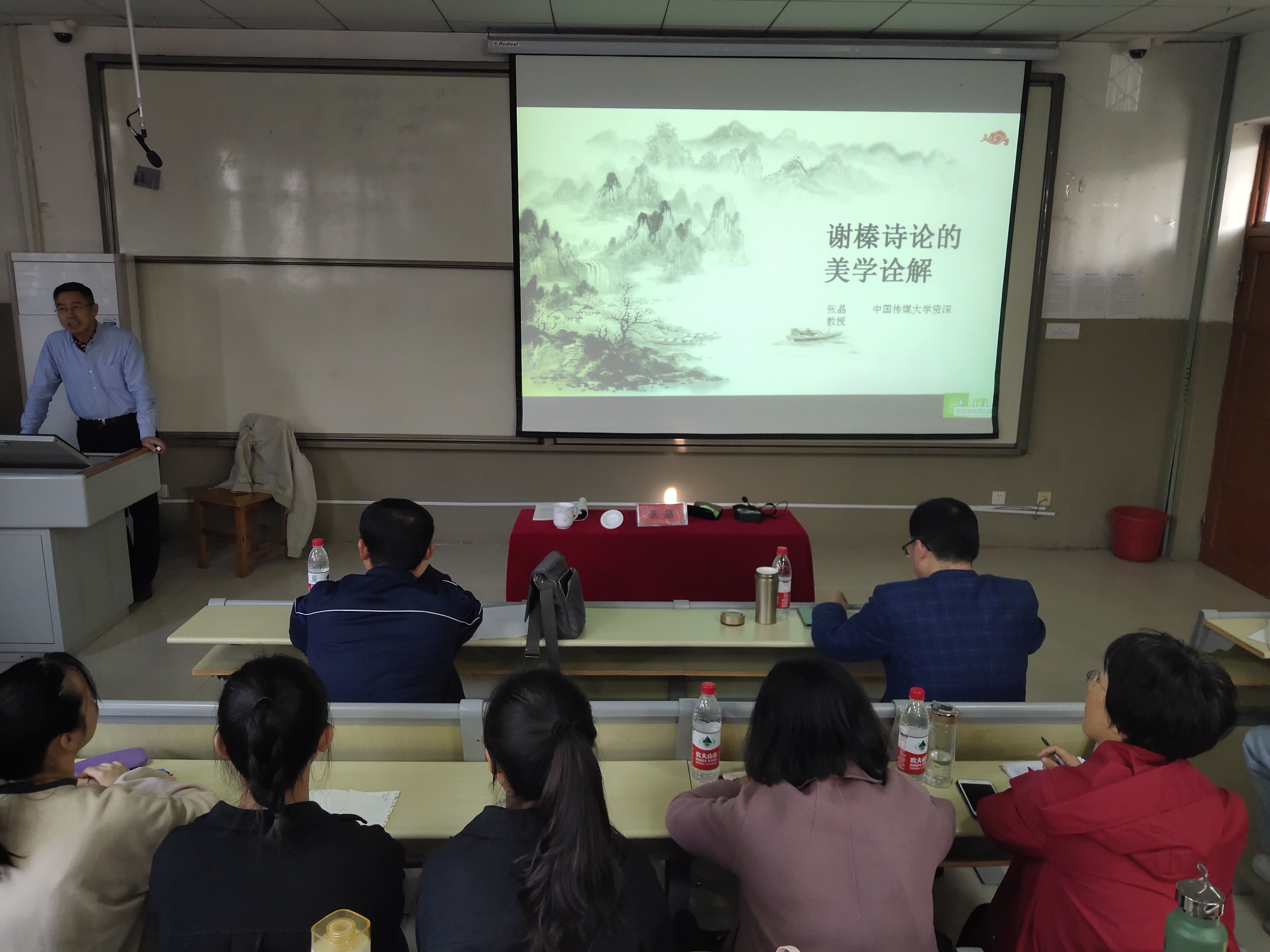 殷学明简单地介绍张晶的学术成就和文学历程,并对张晶的到来表示欢迎,在热烈的掌声中,本次学术报告会正式开始。张晶就谢榛与《四溟诗话》来论述其美学内涵的现代阐释价值及内容,这使在场的老师同学们对“谢榛诗论”有了基本了解。在此基础上,张晶又分别从“兴”的释义、感兴、“兴”的地位和《扪虱新话》等七个方面来介绍“谢榛诗论”:一宋代国学大家李仲蒙提出:“触物以起情谓之兴,物动情者也。”二张晶所著的《美学的延展》中指出,感兴就是“感于物而兴”,指创作主体在客观环境的偶然触发下,在心灵中诞育艺术境界的心理状态与审美创造方式。三谢榛将“兴”作为诗歌创作的基本因素,他认为“兴”既是诗人产生创作冲动的动因,也是到达化境的直接条件。张晶根据七个方面系统全面地讲解谢榛诗论的美学内涵与现代价值。受张晶的启示与感染,同学们纷纷提出自己的疑问,张晶亦就同学们的问题一一进行解释回答。