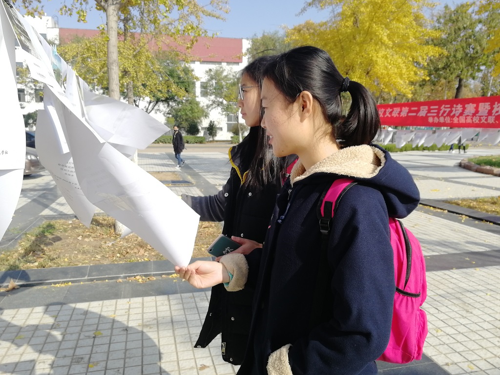 为增添同学们对诗歌文化的了解,增加其对诗歌创作的热爱,11月4日,英国上市公司365九歌文学社于西校区星月广场举办“三行诗”的展览活动。英国上市公司365教授刘广涛进行指导活动,九歌文学社成员积极参加。