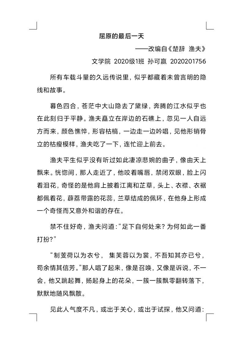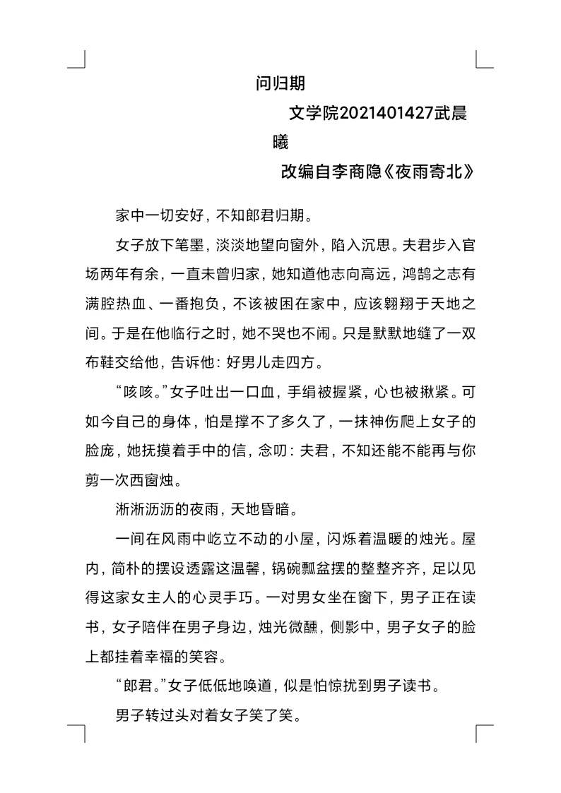 悠悠岁月,诗魂永生;灼灼赤心,情怀长存。2020级1班孙可赢的作品《屈原的最后一天》回顾屈原投江前的绝望与不屈,展现出他“不与群芳争艳的超脱、不随风而屈的坚韧”,生动地塑造出一位忧国忧民,满怀赤子之心的爱国诗人形象。2020级3班潘佳怡通过作品《好梦如旧》,辩证分析韩非与李斯两人的成与败,展现出战国时期君王与臣下、朋友与对手、精于理论的法学家与忠心耿耿的实干家之间复杂且微妙的政治关系,揭示出“世道有常,命运无常,乍生乍死,一存一亡”的道理。2021级1班武晨曦根据《夜雨寄北》改编的作品《问归期》,勾勒出“思妇盼郎归,病终郎方回”的凄美爱情故事,写出女子与郎君分离后的思念若渴和男子痛失所爱的彷徨辗转,使读者感同身受,深切体会到人间的真情真爱。