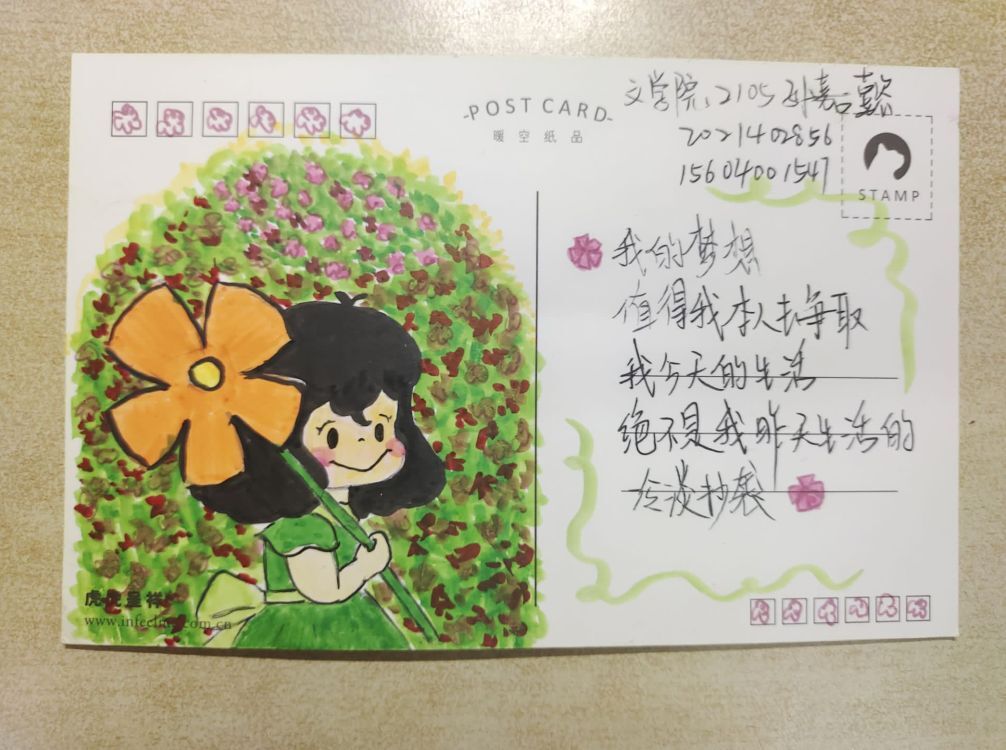春意盎然青满树,书香校园求知路。本次书签设计比赛活动得到广大同学们的积极响应,通过制作书签或明信片的形式,表达对春日读书的期待和向往。杜金阳同学以水彩画的绘画方法,为大家呈现一副色调和谐、清新自然的画面,并配以“枯木逢春”的寄语,充分表达出对春日将至的向往。孙嘉懿同学以翠绿为主调,灵动的画法使卡通风格人物跃然于纸上,并以追寻梦想的文字加以修饰,突出对学校读书生活的期望,展现出其对校园生活的热爱。同学们融情于笔,抒情于画,不仅仅是对春日到来的热切情感,更展现沉浸于书香校园的学子风度。