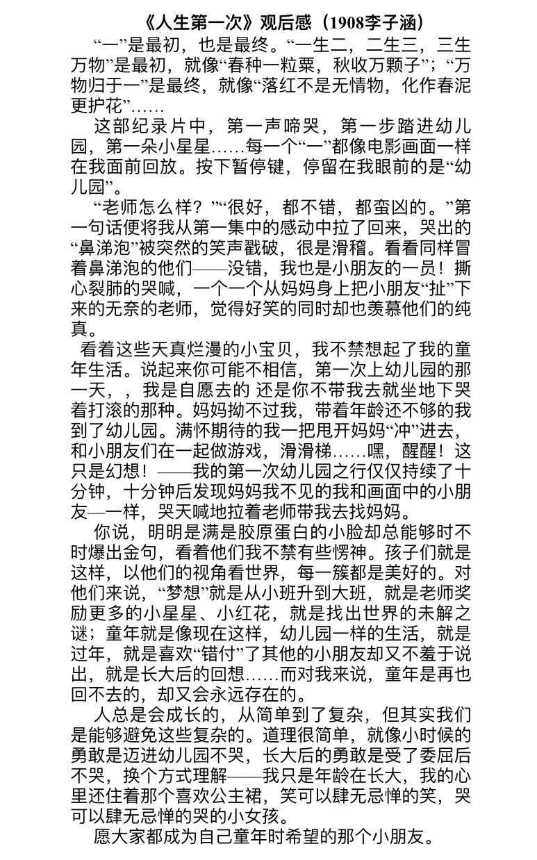 《人生第一次》这部影片以人生中的重要事件为叙事线索,用12个对中国人来讲具有重大意义的人生节点为故事单元,还原展现人生的全过程,同学们从不同的角度出发,记录下自己的感触。童年是人生的起点,2019级8班李子涵与2019级10班李雯雯通过回忆童年时与父母发生的温馨趣事,唤起同学们对纯真童年的追忆;成长是人生路上无法逃避的现实,但2018级9班刘金瑶便通过勇敢选择梦想告诉我们:长大并不可怕,2018级5班朱路荣则鼓励大家积极选择自己想要的人生;2018级5班宋吉哲为我们展示他人生中那些意义深刻的“第一次”,正是因为这些成长的见证,才使人生完整又充满意义;我们是幸运的,从出生在都市的那刻起便不需要为饥寒忧愁,但是留守山区的孩子却不是这样,我们触手可及的对他们可能是奢望,2018级4班王雪梅记录下他们的生活,用文字为他们发声,点燃他们人生中希望的灯盏。