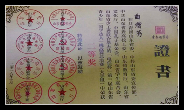 据了解,本次大赛涉及中、小学阶段应知应会国学知识,“”四书五经”、“春秋三传”、“十三经”“二十五史”、“诸子百家”和《四书集注》、《资治通鉴》、《易经》等经典书目;诗词曲戏、书法绘画、衣食住行、民族民俗、建筑工艺、天文历法、古籍古迹、医学艺术等中的传统文化。4月至10月,经过院级淘汰赛、校级初赛、市级复赛的层层挑战、层级选拔,曲增芳脱颖而出,代表我校晋级决赛。比赛现场,轮答、抢答、联想、演讲等多种考察形式轮番上阵,选手们你追我赶,见仁见智,氛围异常激烈。面对实力超群的对手,曲增芳求稳求实,凭借丰富扎实的传统文化知识和过人的文化素养展示,步步出彩、稳扎稳打,一举斩获大赛二等奖。