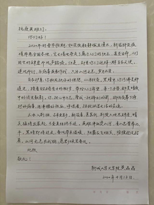 前有英雄先烈为国捐躯,今有抗疫人士不畏艰险。同学们通过“七行情书”或一封书信向抗疫英雄致敬,并将作品以录音或拍视频的形式记录下来,其刚劲有力的字体和感人肺腑的朗诵淋漓尽致地表达出同学们对牺牲在抗疫一线以及火灾抢险中的逆行者们最大的敬意。在作品评分环节中,工作人员将整理好的作品发送给评委,各位评委本着公平公正的原则对每一份作品打出相应的分数并对参赛选手进行相关点评。最后,工作人员收集打分表并进行分数统计,选出本次活动中的优秀作品,其中顾丽婷、黄晶晶、戴琳桐等十位同学荣获优秀奖。