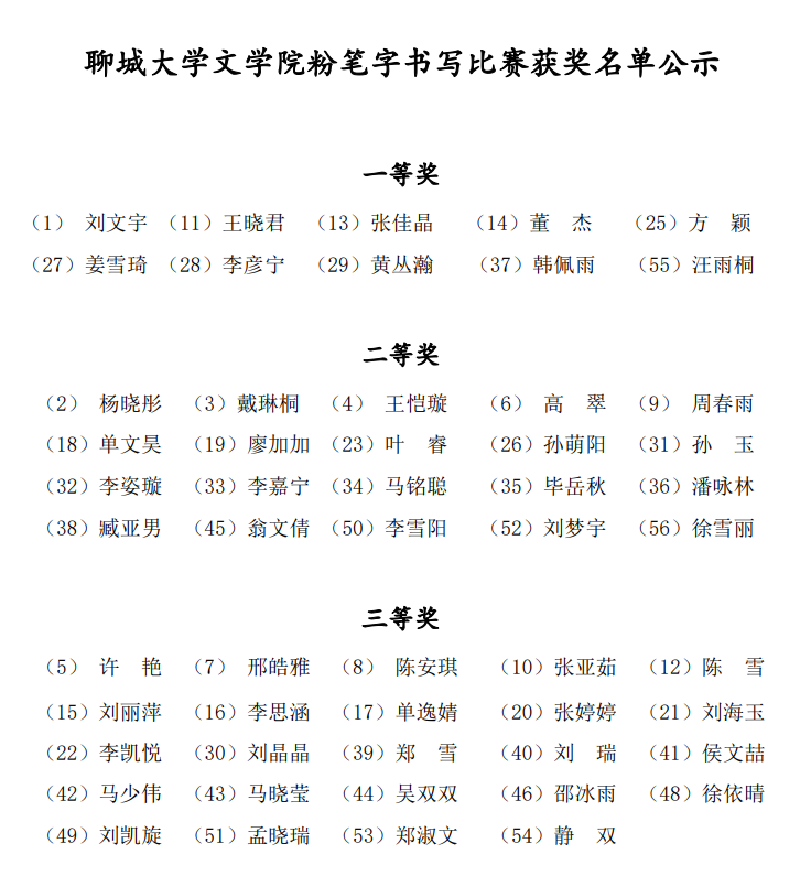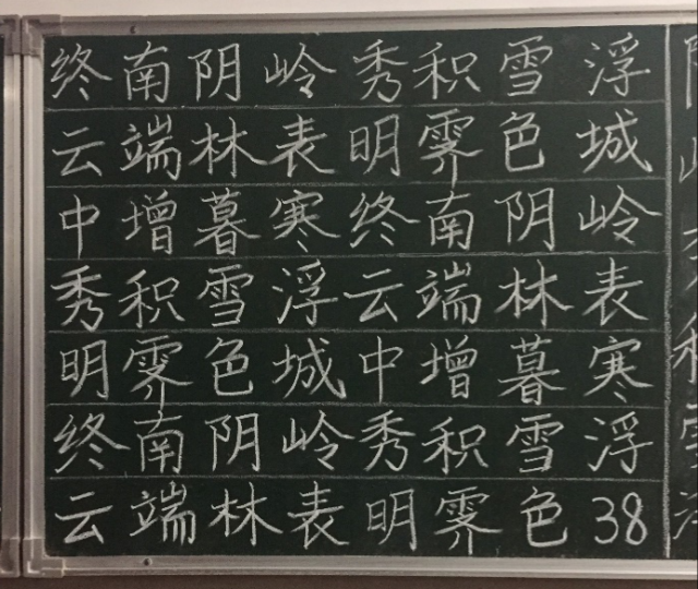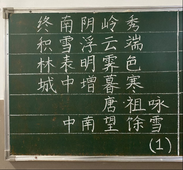 本次比赛以班级为单位进行初赛,从中推选出作品优秀的同学进入决赛。比赛采用现场板书的形式进行,板书内容统一,选自唐代诗人祖咏的《南望雪》:“终南阴岭秀,积雪浮云端。林表明霁色,城中增暮寒。”冬日恰逢暮寒,别是一番滋味,此情此景,此诗此意,相辅相成。比赛开始指令发出后,同学们站在各自的黑板位置前笔走龙蛇,他们目光专注地注视板面,灵动的手指写下一个个娟秀灵动的字,落笔如云烟,观其力而不失,身姿展而不夸,笔迹行云流水,给人以美的享受,在一笔一划的书写中感受作为人民教师应当必备的责任与担当。在所有同学书写完成后,老师对作品进行专业打分,分别评出一二三等奖。王晓君的书法行云流水、气势磅礴;翁文倩的字体娟秀端庄、流美疏朗;臧亚男的作品鸢飘风泊、灵动优美。书到深处见文化,书到极致见精神。每位参赛选手都以一丝不苟的态度纵横在撇、捺之时,行走于横、竖之间。老师们认真仔细地筛选参赛作品,最后评选出优秀作品一等奖10名,二等奖20名,三等奖24名,并将获奖名单公示。