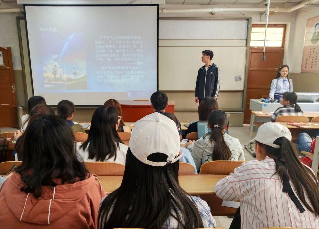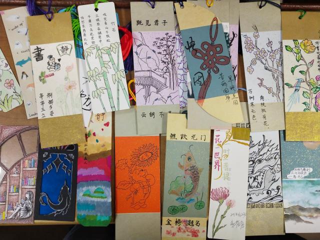 书签被用来定位与记录自己学习与阅读的进度,也可以作为自己行程与前进的标识。同学们带着悉心准备的书签,向大家展示并讲解其创作灵感。毕怡然向大家展示了自创书签《故宫•春》,书签是以故宫博物院藏《兽谱》中瑞鹿图为设计原型,并结合传统文化中的“鹿”,取其意为“福禄”,充分显示了她深厚的文化修养,赢得了阵阵掌声;高嘉文、宋鑫围绕“爱”共同制作了四张书签,创作灵感分别来自于电影《你的名字》中流星划过的场景、诗句“零落成泥碾作尘,只有香如故”、布艺和水彩结合的创新、偶得佳句“日出东山,我心向南”,每一张书签内容新颖,制作精细,引人惊叹不已;赵钰莹的自制书签灵感来自于“孤独”二字,书签上一个小和尚坐在荷叶上钓鱼,仔细看却是一幅荷塘月色图,她说:“孩童、瓜果、小狗和蝴蝶构成的热闹都与你无关,这便是孤独。”引发全场深思。看着那桌上铺满的上百张书签,大家合影留念。