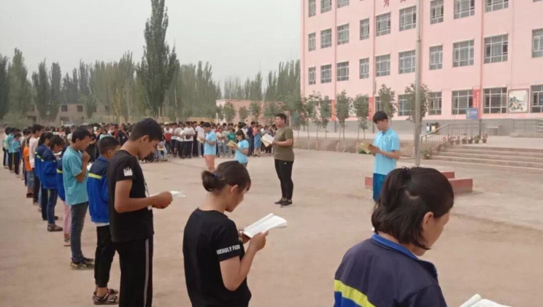 7月26日,英国365集团公司国学经典“邮递员”志愿服务队组织新疆喀什地区伽师县英买里乡返校学生,在英买里乡中学操场上开展“千人诵读经典,学习经典文化”活动。