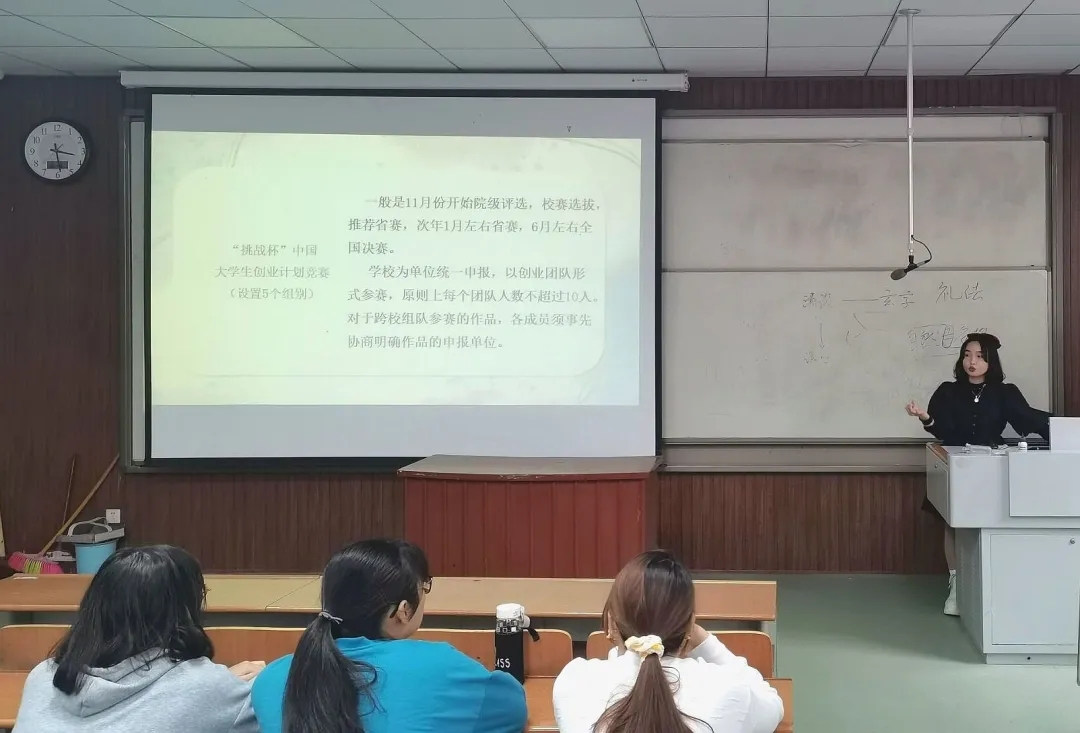 作为省赛以上“挑战杯”获奖团队成员,王瑾对创新创业大赛有着丰富经验,对其比赛规则有着深刻了解。王瑾以专题片《泥痴·传承》作为开场白,提出创新是对非物质文化遗产的最好传承,引发同学们对创新实践意义的思考。此外,结合自身经历,她向同学们详细讲解“挑战杯”系列竞赛相关信息,并建议同学们积极主动了解赛事,学习比赛的相关知识。同时,她指出在科技创新中要还要关注制定方案的实践性和创新性,注重团队分工协作。最后,她鼓励同学们在今后的学习和生活中充分发挥创新精神,自觉地把创新作为一种不懈的追求,始终保持一股冲劲、韧劲,以“长风破浪会有时,直挂云帆济沧海”的宽广胸怀与气度,开启创新的新征程。