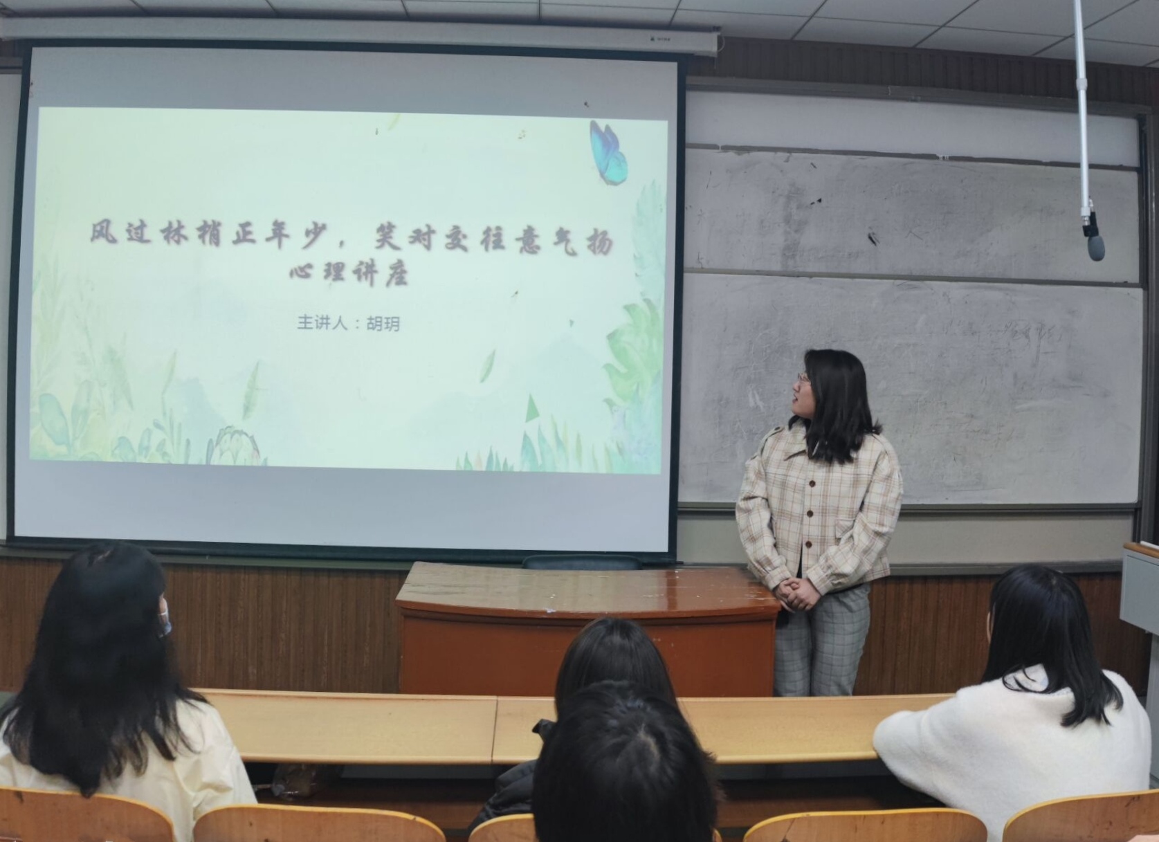 胡玥首先对大学生人际交往进行简单介绍,她说“人际交往是一个信息传递和情感交流的过程”。她引用亚里士多德的名言“能独自生活的不是野兽就是上帝”来强调在大学生活中人际交往的重要性。随后就大学生人际交往的常见问题进行了详细的阐述,在阐述的过程中胡玥与在场同学们进行互动,同学们通过社交恐惧症自测对社交恐惧症有更加深入的了解。最后,胡玥具体讲解大学期间人际关系的舒缓方法,通过生动的语言和令人深思的例子,让同学明白如何处理人际关系,从而在纷扰的人际关系中把握住一根明确的准绳。