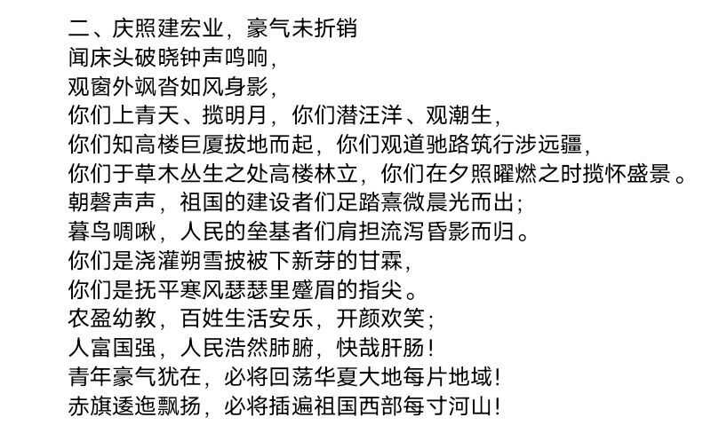 关注西部发展,歌颂奉献精神。同学们深入了解“西部计划”发现越来越多的优秀青年选择前往西部基层,用实际行动践行"弘扬繁森精神,西部建功立业"的青春誓言。西部计划志愿者在基层留下青春的脚印,挥洒奋斗的汗水。感动于“奉献、友爱、互助、进步”的志愿精神,同学们落笔于情,写下一首首动人的诗歌。孟伟捷以“寻找一双眼睛”起笔,思绪一路飘飞,落笔于远离霓虹的西部,借西部志愿者的眼睛写出他们内心的澄澈;侯梦蝶将拳拳之情诉诸笔尖,单押成韵,赞美志愿者们“不为世俗的眼光,只寻内心的善良,守候心中那片未曾耕耘的神圣土壤”,让人感动之余更觉诗歌韵味;吴浩然以蒲公英为喻,写下“风刮去年华留下种子,终有一日,在每一处满天绽放”,用满天星和霞草赞美西部志愿者的美丽坚韧、团结奉献,使人读毕潸然泪下;于文浩用跑马、草原、苍鹰、碧水还原志愿者一路向西的景色,又将天山雪莲傲霜寒梅比作志愿者赞美他们绽放在祖国最需要的地方。
