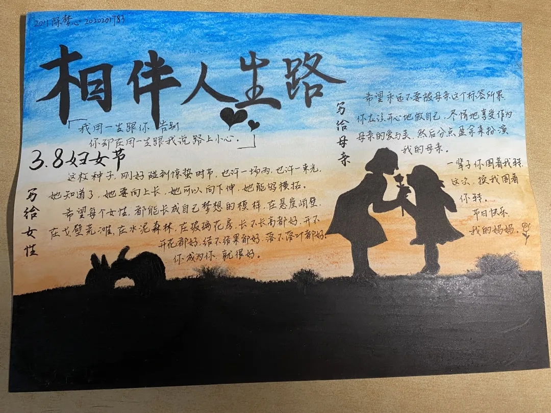 云想衣裳花想容,春风拂槛露华浓。此次活动通过三行情书或手抄报的形式,来表达赞美女性或歌颂母爱的主题。参赛作品总总林林,各有千秋。 叶欣哲与李瑞瑶的三行情书用一件件小事、一幅幅场景,简练概括的描写母爱的寸草春晖、无微不至。“休言女子非英物,夜夜龙泉壁上鸣。”高文璨与辛晓淇的三行情书以比喻、对比等写作手法浪漫的赞美女性,鼓励她们勇敢追求属于自己的星辰大海与万丈光芒。2020级11班陈梦心的手抄报整体色调和谐、主题鲜明,用黑色重墨描画了孩童赠送母亲花朵的轮廓,给人留有无限遐想。“第一次送给母亲的花,是象征着不朽的母爱的康乃馨。”2021级11班张文静的手抄报以一束康乃馨为主题,通过粉色渲染一种温馨的氛围。同学们借诗抒情,以画达意,倾情创作。一封封“三行情书”,一幅幅手抄报,无不展示着同学们对女性的赞美及对母亲的爱意。