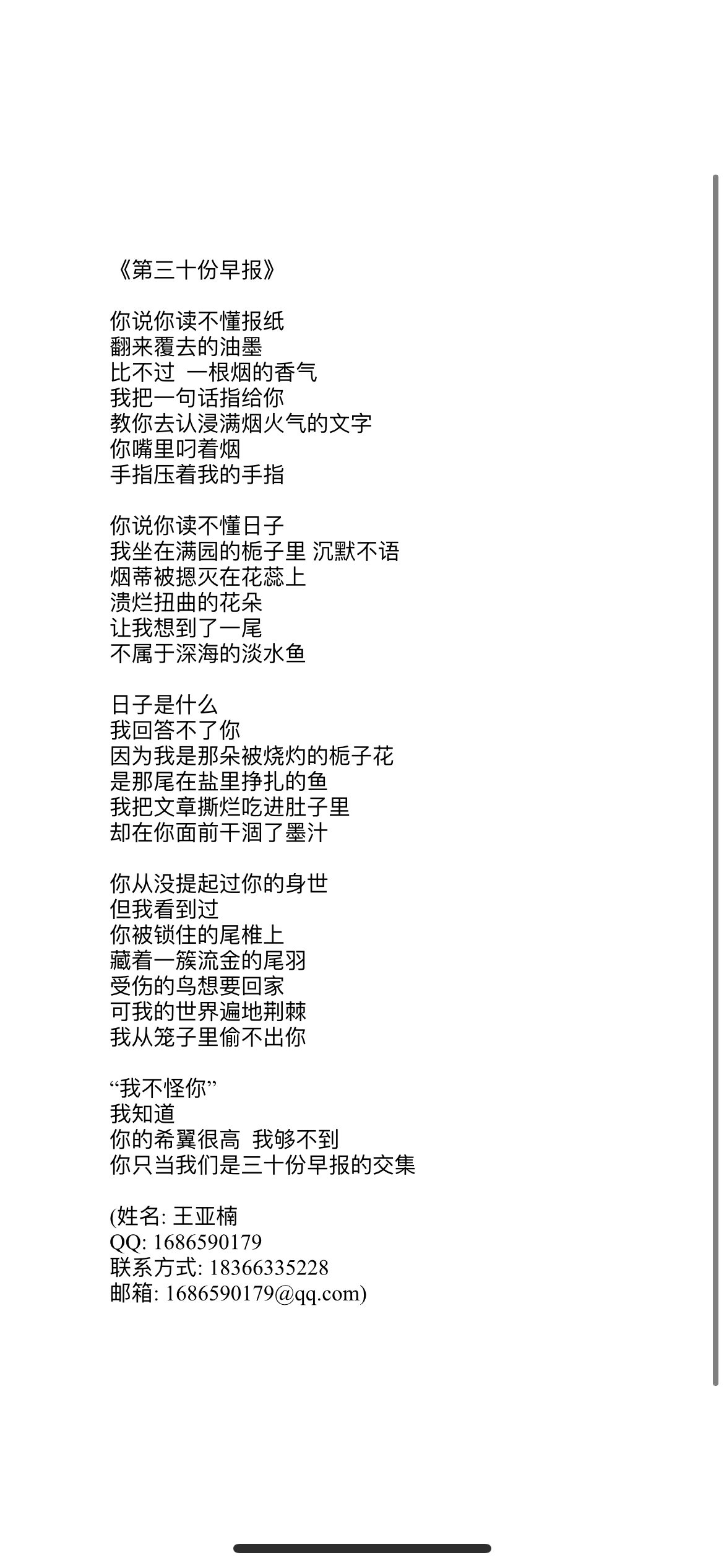 春天的诗很美,倾听春天的声音,是微笑的期盼。王亚楠笔下的《第三十份早报》,营造了一段婉约文艺带着遗憾的浪漫邂逅,文静而忧伤的少女和吸着烟的沉默男孩,一首不算长的小诗,写满少女明媚的忧伤和怀揣着的心事,有些苦涩又带着少年的偏执。陈发翠的《因为她与春光同行》,开篇将年迈且身患疾病的奶奶与醉人的春光作对比,叹息悲痛于奶奶“春光”的消散。作者又起笔写到和奶奶曾经那些美好的回忆,写奶奶对于家庭的奉献,那些逝去的春光,亦会永远化作点滴的爱,留在心里。程尚《我似鲸向海》一文,按照时间线索分别描写作者在人生的四个不同的时间阶段对海的感受,伴随着对海的感悟不断深化从而获得成长,作者对待生活与岁月的温柔与赤诚,感染人心。