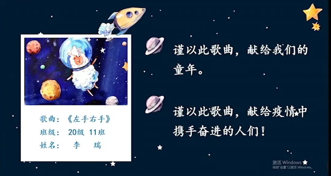 本次活动分为儿歌原创与儿歌演唱两种形式展开,天真烂漫的情结或凸显,或隐蔽,童心在每个人的心中都似傍晚的云霞璀璨,“身旁缠绵的萤火,月色朦胧的衣着”,李永振的一首《夜晚》静谧含蓄,美好的夏夜在同学们的眼里尽情展现,平静中对自然与爱的追求喧然跃于纸上;“凑近风、靠近蝶,看柳花随风飘荡”,刘文静用一篇《悄悄》展现体现童年时代的无忧无虑与随意灵动,在她笔下,一个个小小身影淋漓尽致地展现出鲜活的生命力。在聆听儿歌演唱作品的过程中学生们重新回到那个可以欢腾灵魂,肆意抒发的无忧天地。“黑黑的天空低垂,亮亮的繁星相随”,静双以一曲《虫儿飞》编织抒情的童话,聆听儿时情韵悠长的思念;“没有椰林醉斜阳,只是一片海蓝蓝”,齐文馨借《外婆的澎湖湾》追忆绚丽的幻想,夕阳的余晖洒落在温暖的大地上,一个脚印,一串笑语,一曲终了,一生回望。