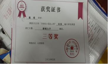 大学英语词汇大赛中荣获三等奖奖项。本次奖项的取得不仅是鹿瑾同学个人的荣光,同时也是学校的自豪。在此,向鹿瑾同学表示诚挚的祝贺。