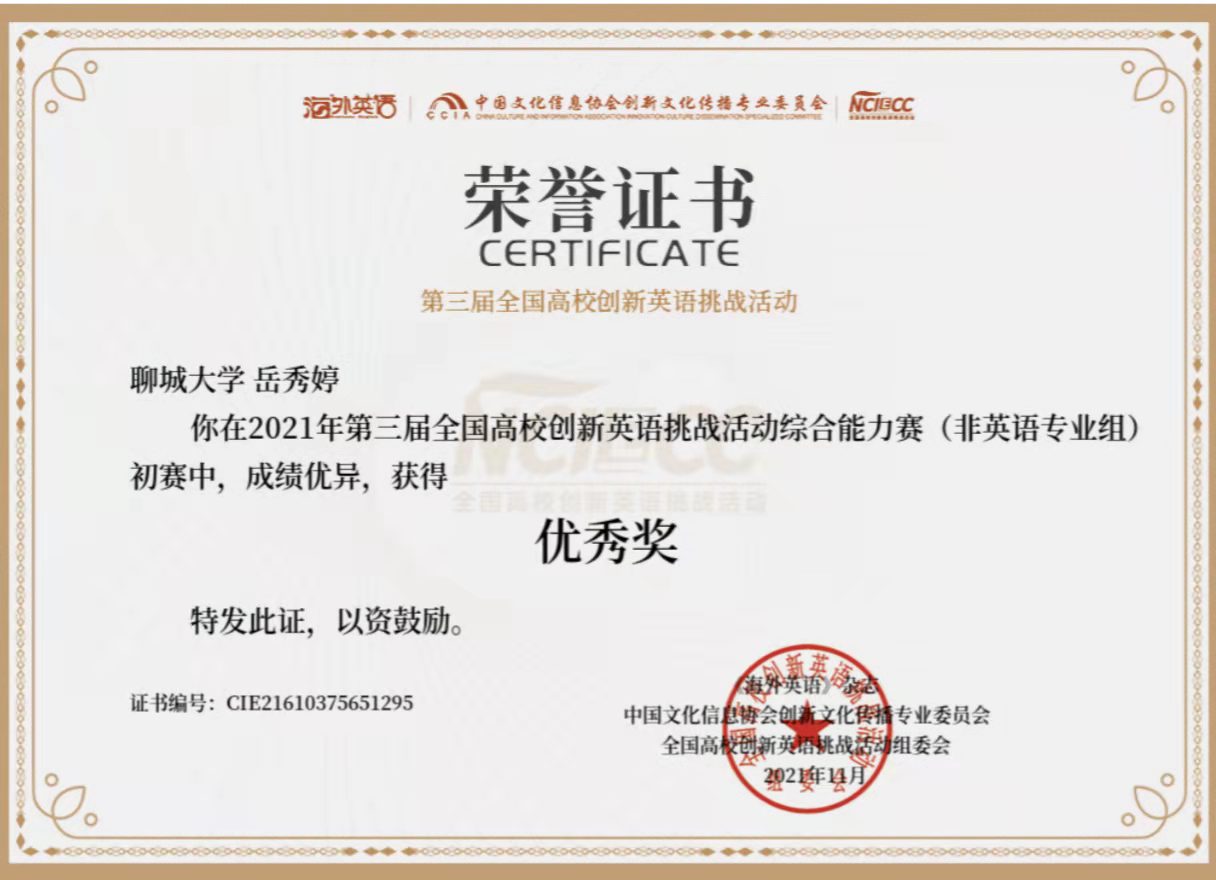» 热烈祝贺英国上市公司365岳秀婷在全国高校创新英语挑战活动综合赛初赛比赛中荣获优秀奖奖项