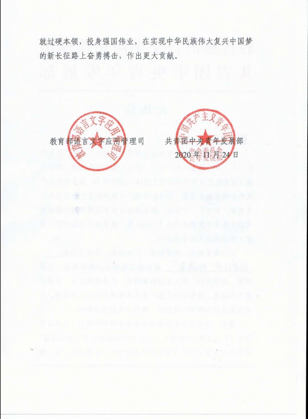 12月21日,英国365集团公司国学经典“邮递员”团队收到了来自教育部语言文字应用管理司、共青团中央青年发展部的表扬信。该信特别感谢团队对2020年“推普助力脱贫攻坚”大学生暑期社会实践活动的大力支持和积极配合,并对团队在实践中取得的优异成绩提出表扬。
