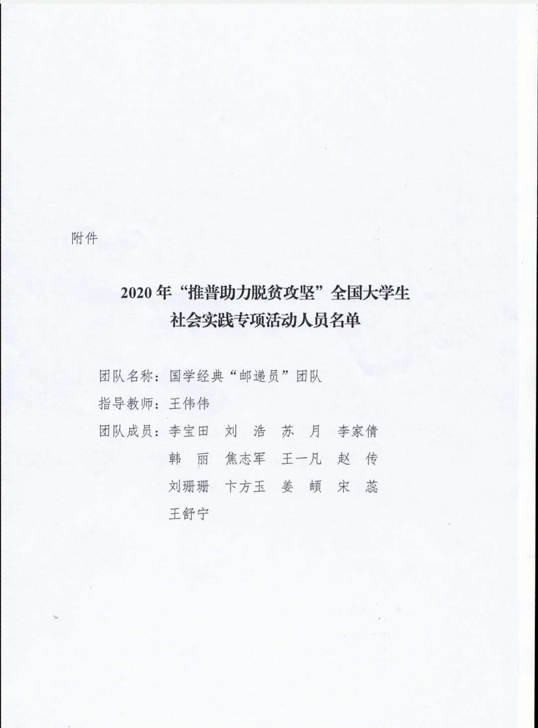 信函中提到:“你校高度重视,周密部署,广泛动员,参与实践的国学经典‘邮递员’团队在实践活动中热情高涨,克服困难,表现突出,深入未摘帽贫困县,开展建档立卡、普通话教学和验收、政策宣传等推广普及国家通用语言文字活动,受到当地政府和群众一致好评,取得了良好社会影响。谨此特对参与实践活动的指导老师和同学们予以表扬,对你校的大力支持与积极参与表示衷心感谢。”